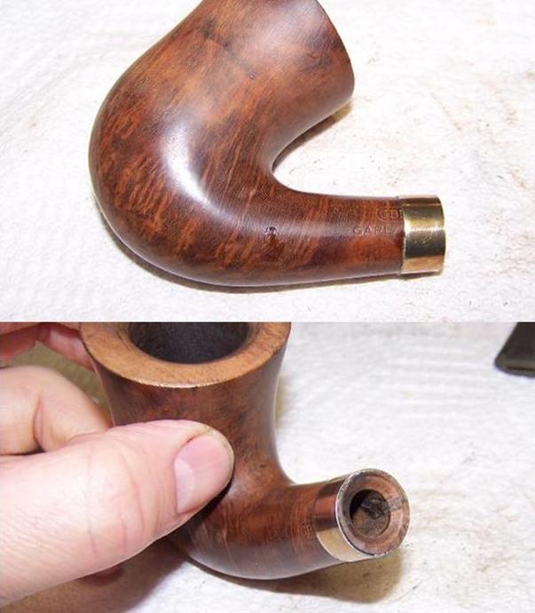 I removed the band and heated it up again. I smeared a little CA glue around the end of the shank and was able to seat the band squarely. This time about 3/8” onto the shank. Once cool, I used a skinny wheel on a rotary tool to trim of the excess band material and flush it up to the end of the shank. Although the band covered up the COM stamp and ‘AND II’ of ‘GARLAND II’ it was necessary and it gives the stummel a touch of class.