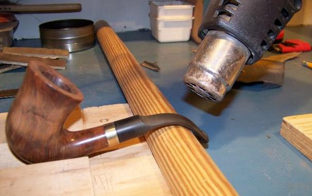 With the stem fitted it was time to bend the stem. I have jig for holding round stock and I used this to hold the assembled pipe steady with the bit resting on a 1-1/4” round dowel. Using my heat gun, I heated the bit until it draped over the dowel. I dipped the bent stem in water to cool the vulcanite and set the shape. Then I checked the angle of the bend and had to repeat the process a couple of times until I had what I thought was the original stem shape just right.