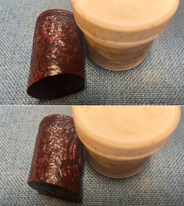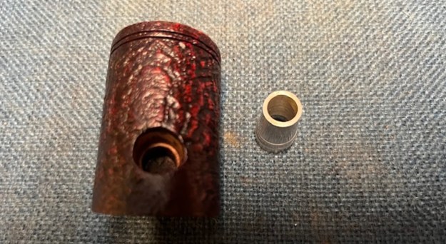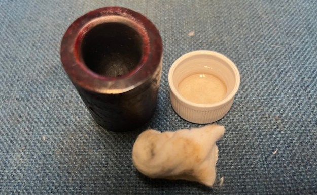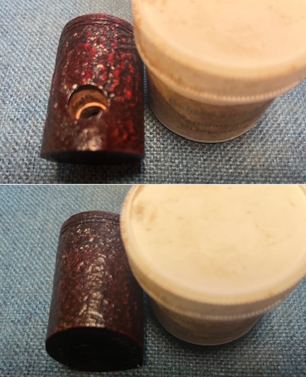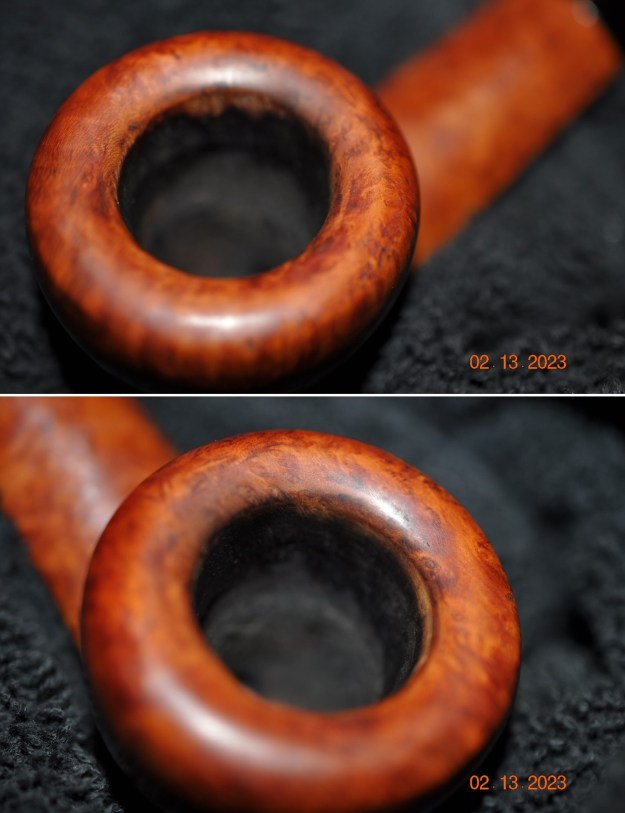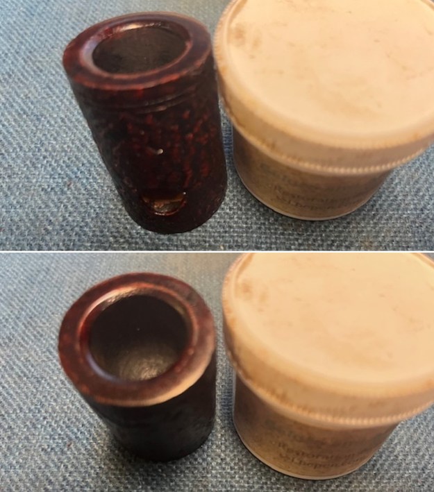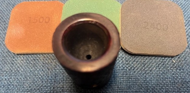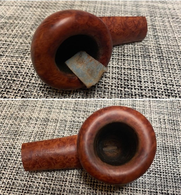 I started on the bowl. The first step was to ream it out – that is to say, remove all the cake inside the bowl. This accomplished a couple of things. First (and most obviously), it cleaned the bowl and provided a refurbished chamber for future smoking. Second, when the old cake was removed, I could inspect the interior walls of the bowl and determine if there was damage or not. Fortunately, there was none. As the cake was light, I used a pipe knife, and a piece of sandpaper taped to several sizes of wooden dowel. Collectively, these ensured that all the debris was removed.