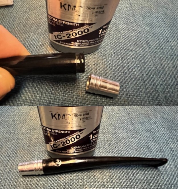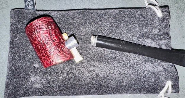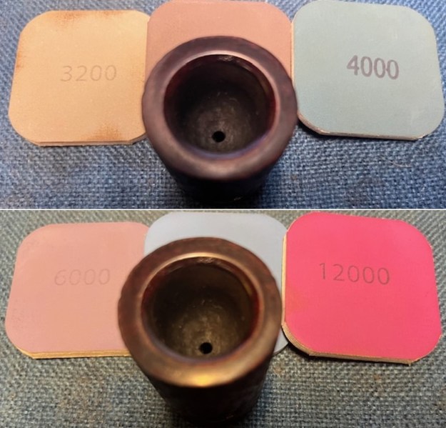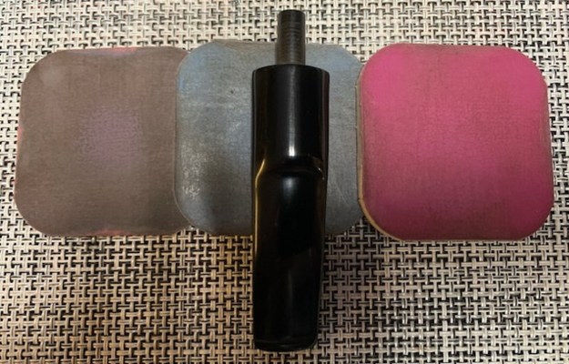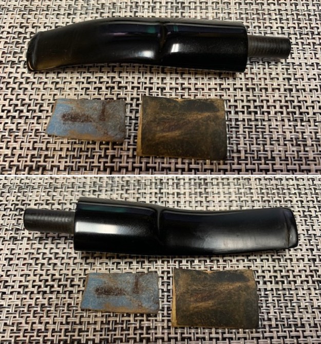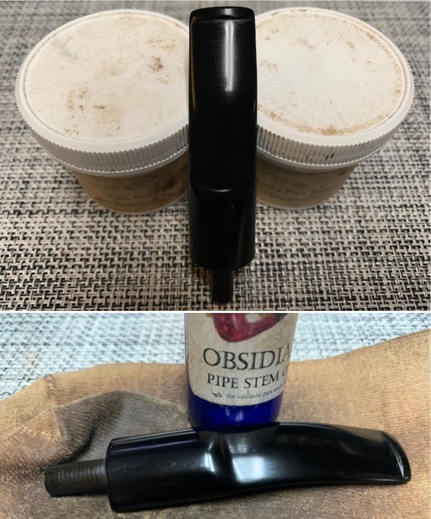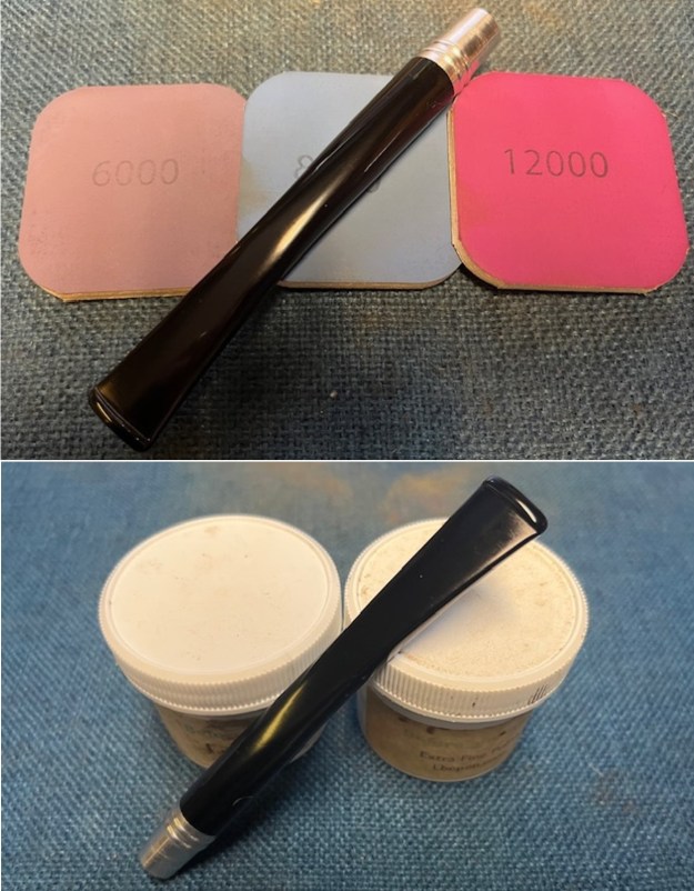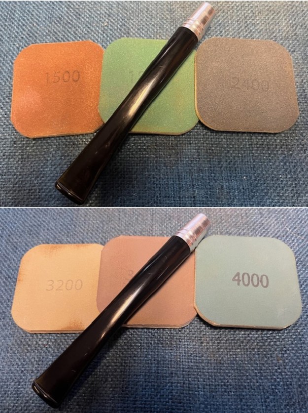 Following that, I used all nine of the micromesh sanding pads (1,500 through 12,000 grit) to sand out flaws in the stem, even out the acrylic, and provide gentle polishing of the finished surface. I also applied pipe-stem oil while using the last five micromesh pads. There was a wonderful, deep black shine to the stem when I was done.