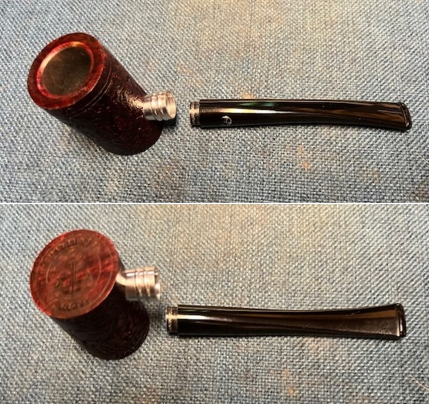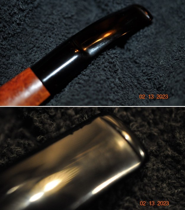 Let’s have a look at the marks. On the underside of the bowl, engraved in the metal, is the word Falcon. Also engraved, inside the centre circle, is the shape number 7. At the opposite end of the shank, near the stem, is engraved the letter D. The number 7 is the mould number from the factory and the D indicates that this pipe has a dental bit (as previously mentioned). The lack of a country-of-origin mark indicates that this one was made in the USA.