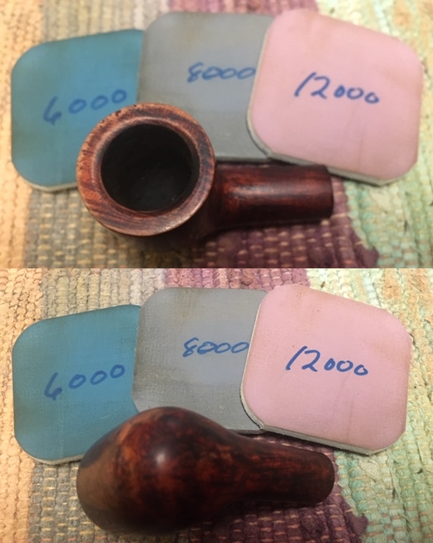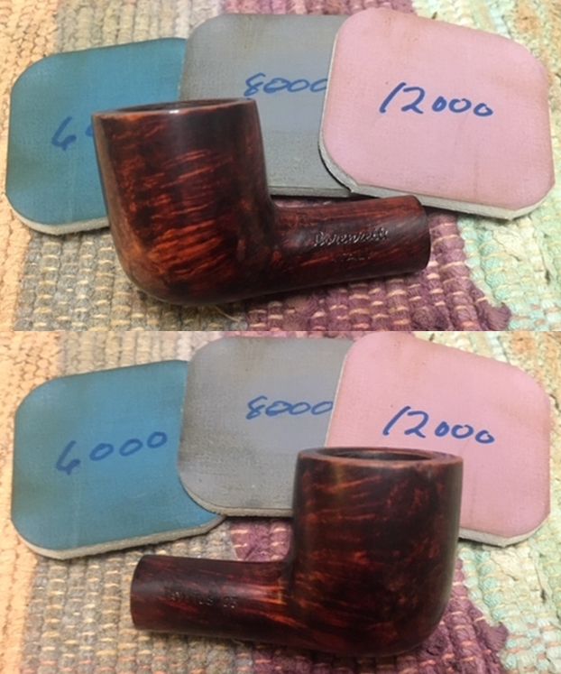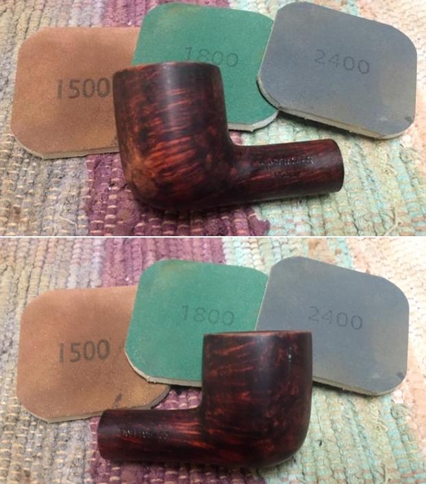 I decided to start my work on the pipe by reaming the bowl with a PipNet pipe reamer using the first and second cutting head to take the cake back to bare briar. I cleaned up the reaming with a Savinelli Fitsall Pipe Knife. I sanded the walls with a piece of 180 grit sandpaper wrapped around a dowel to smooth them out. I wiped the bowl down with acetone to remove the tarry build up and the varnish on the briar. There was a lot of grime that came off with the varnish. It still needed a lot of work but it was looking better. I scrubbed the exterior of the briar with a tooth brush and undiluted Murphy’s Oil Soap. I rinsed it off with warm water to remove the grime and soap. It looked much better and the dust and debris was gone. I dried it with a cotton towel. Next, I worked on the rim top of the bowl to clean up the bevel and the inner edge. I also worked on the marks around the bowl that needed work. It took some work but it cleaned up well. I used a folded piece of sandpaper to clean up the inner edge of the rim and to sand the darkening off around the bowl sides. I scrubbed out the internals of the pipe with 99% isopropyl alcohol, pipe cleaners and cotton swabs. I cleaned out the airway in the stem as well. The airway into the bowl was a little different. It was in the bottom of the bowl toward the back. It has some wear on the top edge of the airway entrance. I worked on these areas repeatedly until the shank and the airway in all the parts was clean.I stained the bowl and shank with a light brown stain wash. I applied it to the surface of the briar with a wool dauber. I flamed it with a lighter flame to set it in the grain. I repeated the process until I was satisfied with the coverage. I polished the  shank extension and the briar with micromesh sanding pads – dry sanding it with 1500-12000 git sanding pads. I wanted to make the new stain coat a bit more transparent. I wiped it down with a cloth and some Obsidian Oil. The bowl had a very fowl tobacco ghost that hung over the pipe and the desk top where I was working on it. I stuffed the bowl with three cotton bolls and twisted one into the shank end. I used an ear syringe to fill the bowl with alcohol. I let the bowl sit for several hours to work on the stem. Once I came back to it the cotton boll was filthy. Once it was removed I ran pipe cleaners through and the pipe smelled much better. I worked some Before & After Restoration Balm into the surface of the briar with my fingertips to clean, enliven and protect the briar. I let the balm sit for 15 minutes and then buffed with a cotton cloth to raise the shine. The photos show the bowl at this point in the restoration process. With that done, the bowl was finished other than the final buffing. I set it aside and turned my attention to the stem. I polished the oxidation and tooth chatter on the stem with micromesh sanding pads – wet sanding with 1500-12000 grit sanding pads. I wiped it down after each sanding pad with Obsidian Oil. I finished polishing the stem with Before & After Pipe Stem polish (both Fine and Extra Fine) then wiped the stem down with another coat of Obsidian Oil.I polished finished Lorenzetti Italy 3200-20 Bent Egg Sitter with Blue Diamond to polish out the remaining small scratches. I gave the bowl and the stem multiple coats of carnauba wax and buffed the pipe with a clean buffing pad to raise the shine. I hand buffed it with a microfiber cloth to deepen the shine. The pipe polished up pretty nicely. The smooth briar shows the effect of the brown stain wash and works very well with the black acrylic stem. The finished pipe is shown in the photos below. I have worked on several Lorenzetti’s over the years and I have always been impressed by his ability to a craft a comfortable and functional smoking pipe. The Length: 5 ½ inches, Height: 2 inches, Outside diameter of the bowl: 1 ¼ inches, Chamber diameter: 7/8 inches. The weight of the pipe is 64 grams/ 2.26 ounces. I will be putting it on the rebornpipes store in the Italian Pipemakers Section if you would like to add it to your rack and carry on the previous pipeman’s legacy. This is an interesting estate to bring back to life.