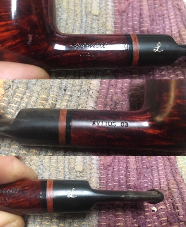 Alex has been an ongoing source of restoration projects for me for a few years now. I actually have a box of Alex’s pipes that he drops by periodically and adds new ones to. It has been fun to see him pick up the restoration hobby himself lately. He leaves the harder ones to me to work on – whether harder in terms of issues or harder in terms of cleaning. I have quite a few of his to work on so I spread them among the others that I am working on. This next pipe is an interesting Lorenzetti Lovat that was one of his first pipes. It has some issues with the finish that will need to be addressed. The pipe is stamped Lorenzetti over Italy on the left side of the shank and Avitus 03 on the right side. It has been in the box for quite a while now so I took it to the work table. The finish is a combination of reddish browns and dark brown in streaks on the bowl sides. It almost appears that it was to make it look like grain. There were some spots around the heel and sides of the bowl where it looked like the shellac coat was peeling off the bowl. The rim top had an inward bevel that had some darkening to the inner edge on the back of the bowl. There were some nicks around the outer edge toward the front. The stem was lightly oxidized with calcification around the button. It has the cursive Lorenzetti “L” on the left of the saddle stem. There were tooth marks and chatter on both sides of the stem ahead of the button. I took some photos of the pipe as I received it.  I took a close up photo of the rim top. It shows some darkening on the back of the inward beveled top. The outer edges were nicked and damaged on the right side. The photos of the stem show tooth marks and chatter on both sides ahead of the button. The stem is also quite oxidized.I took photos of the stamping on both sides of the shank. You can see that it reads as noted above. I also took a photo of the stamping on the side of the saddle stem.I took photos of the bubbled finish around the sides of the bowl. It looked to me that the bubbled portions were over putty fills in the briar. Time would tell! I don’t believe I have worked on this brand before so I turned to Pipephil to get a quick overview of the brand (http://pipephil.eu/logos/en/logo-l6.html). I have included a screen capture of the information on that site for quick reference. I learned that the brand was created in 1934 by Otello Lorenzetti. As of (2009) the company was managed by Alessandro Lorenzetti.I then turned to Pipedia and found a great historical survey of the founder Otello Lorenzetti. It is a great read regarding the history of the brand and its development from small beginnings with Otello selling pipes from his bicycle around his community to a brand that is available around the world today. (https://pipedia.org/wiki/Lorenzetti).