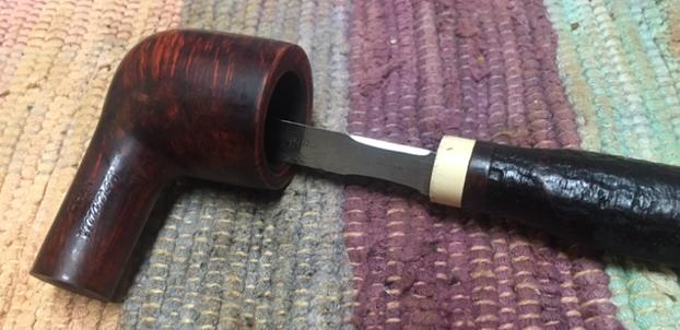 I reamed the bowl with a PipNet pipe reamer and the 2nd and 3rd cutting heads to remove the heavy cake. I took it back to bare briar and then cleaned up the reaming with a Savinelli Fitsall Pipe Knife. I sanded the bowl with a piece of dowel wrapped in 220 grit sandpaper.