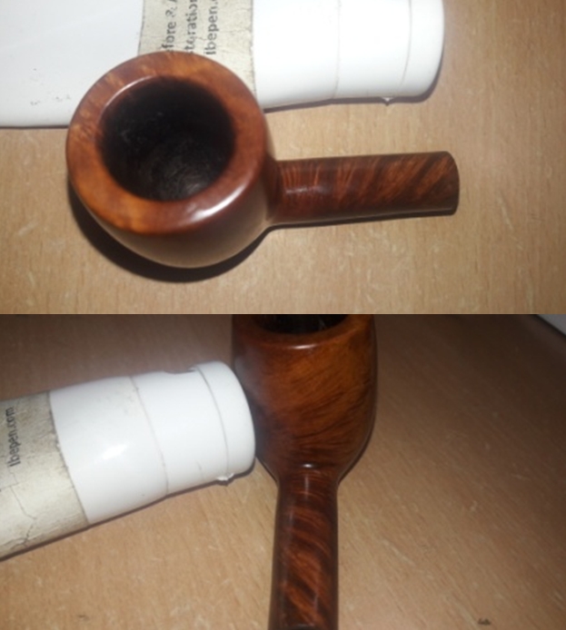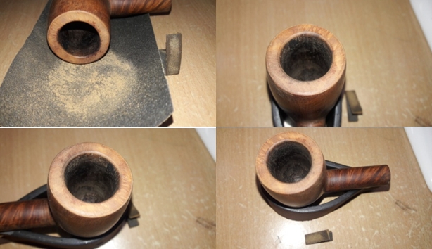 With the stem repairs set aside to cure, i reamed the bowl with my Pipnet pipe reamer using the first head size. Using my fabricated knife, i cleaned the cake from areas which could not be reached by the reamer heads. I used a 220 grit sand paper, pinched between my thumb and forefinger, to sand the inner walls of the chamber. Once i had reached the bare walls, i wiped the chamber with a cotton pad dipped in isopropyl alcohol. This removed all the residual carbon dust and also allowed a clear inspection of the walls. The walls of the chamber are nice and solid with no signs of heat fissures or cracks. The beveled inner rim edge shows no charring or chipping.