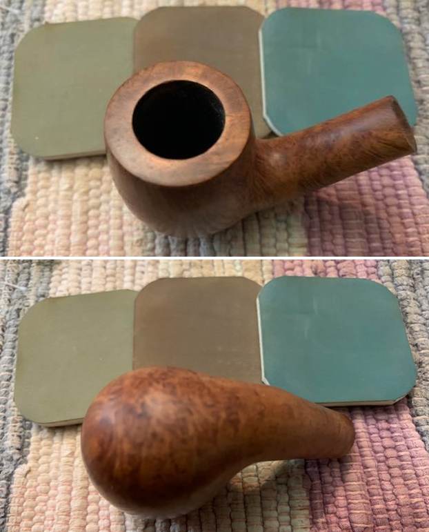 Next, I rubbed a small quantity of “before and after restoration balm” in to the briar with my fingertips, working it deep in to the sandblasts and let it rest for a few minutes. The balm almost immediately works it’s magic and the briar now has a nice vibrant appearance with the beautiful sandblast patterns displayed in their complete splendour. I further buffed it with a horse hair brush.
