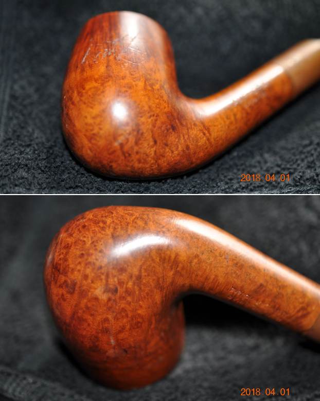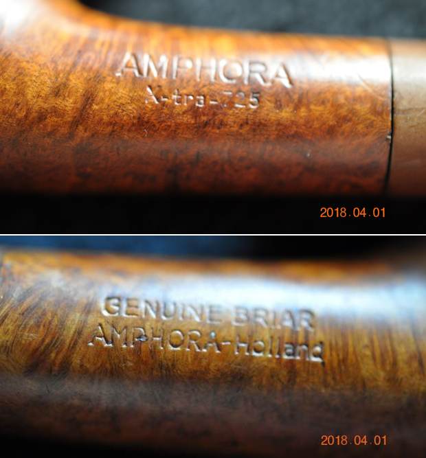 The pipe is stamped as “Genuine Briar” over “Amphora Holland” towards the bowl followed by “Amphora” over “X-tra – 728” towards the shank end. The stem bears the trademark stem logo “A” in a circle on the left side on the saddle portion of the vulcanite saddle stem. The stampings are clear and easily readable.