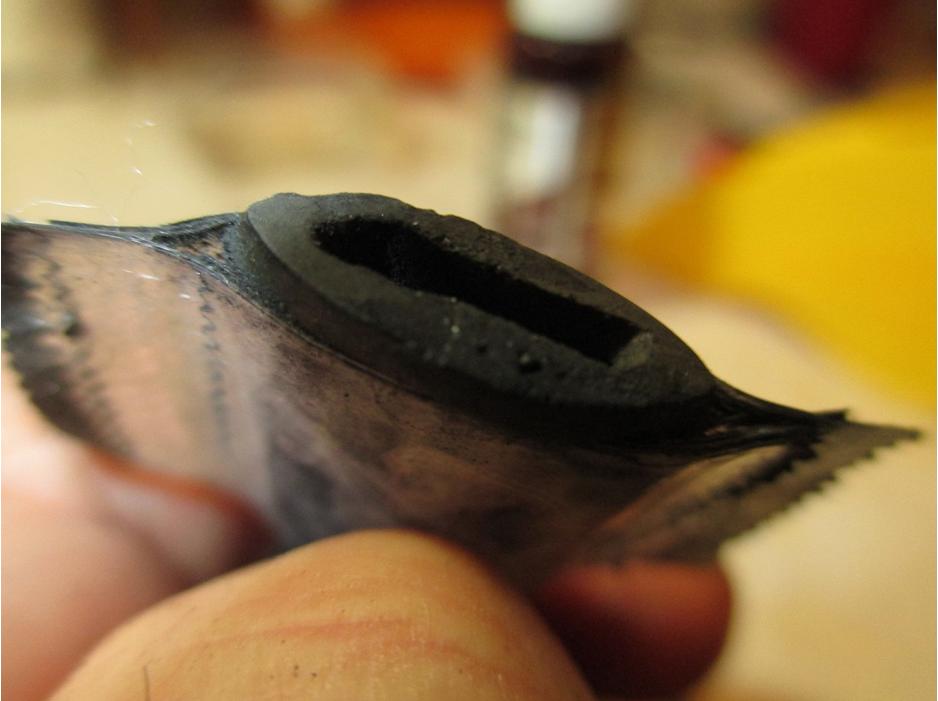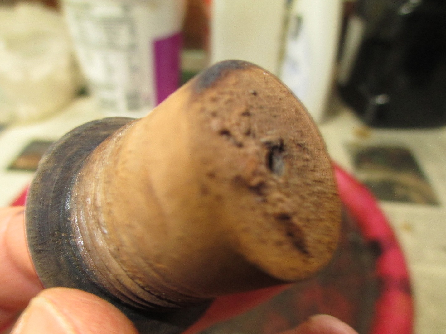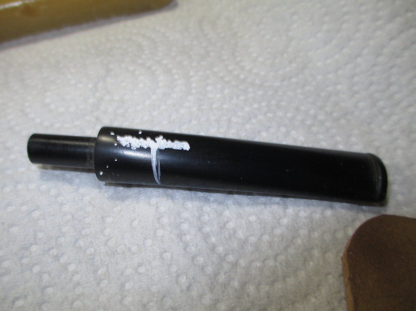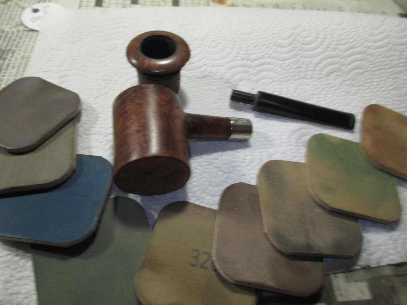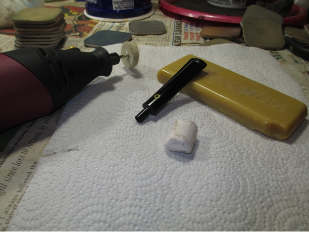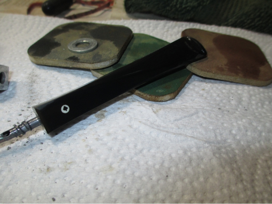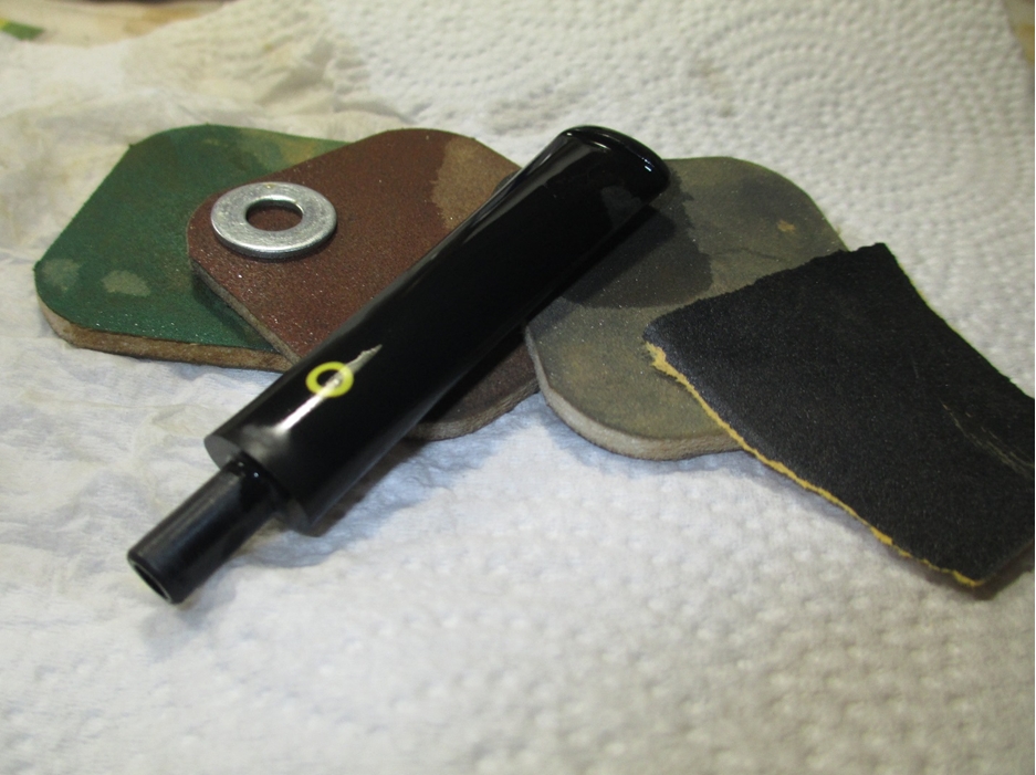Once the rim was to my liking I started on the bowl with the 400 grit wet/dry. I sanded around the marking on the shank and kept the stem inserted while working on the end of the shank to prevent rounding.