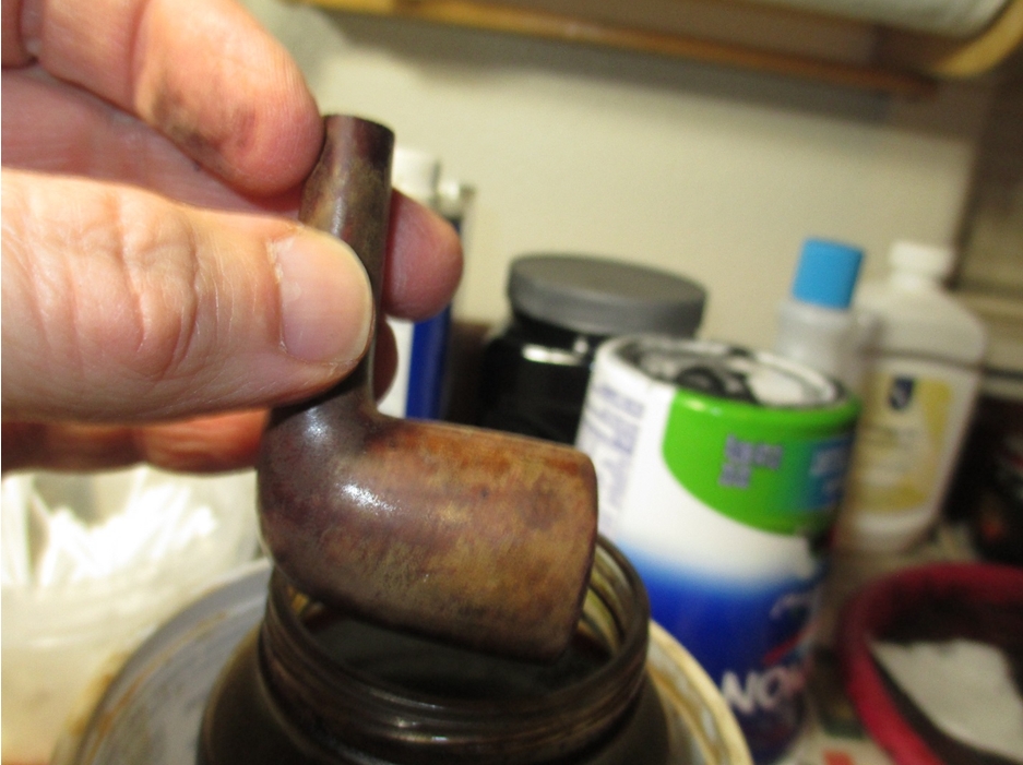 I start this pipe as always by soaking the bowl in the alcohol bath. Here is the pipe right after it came out.