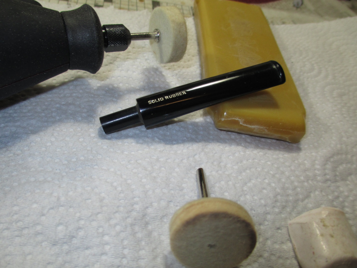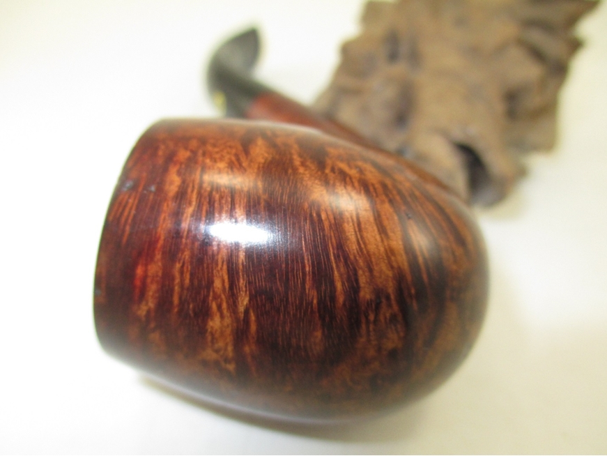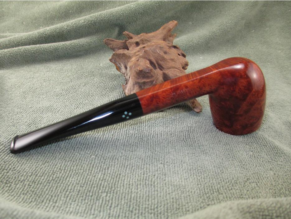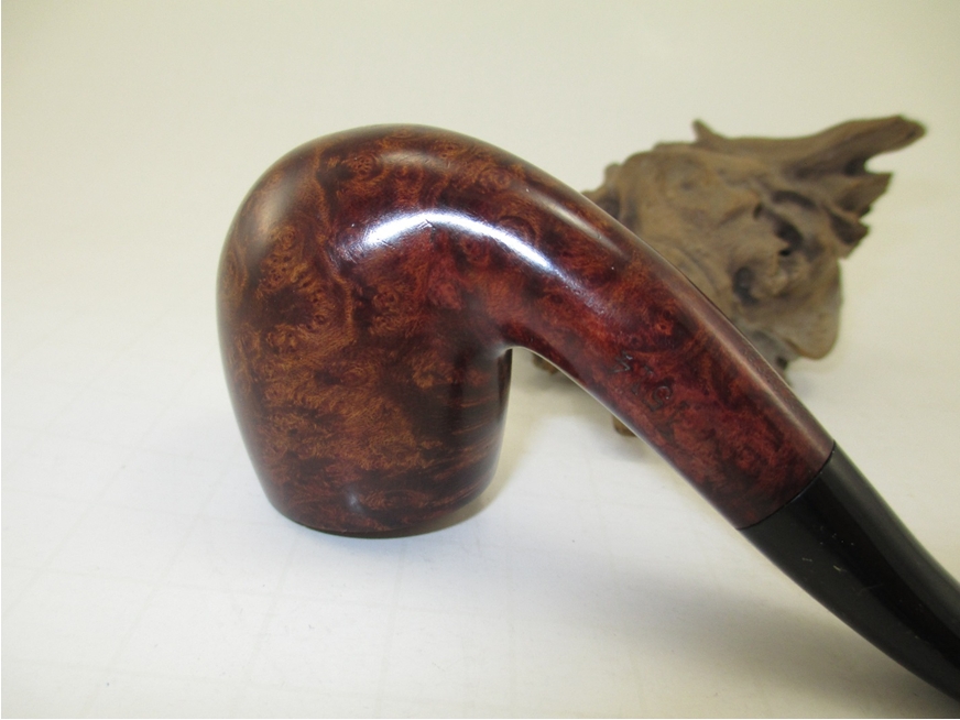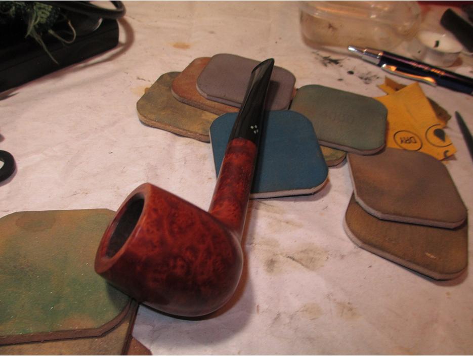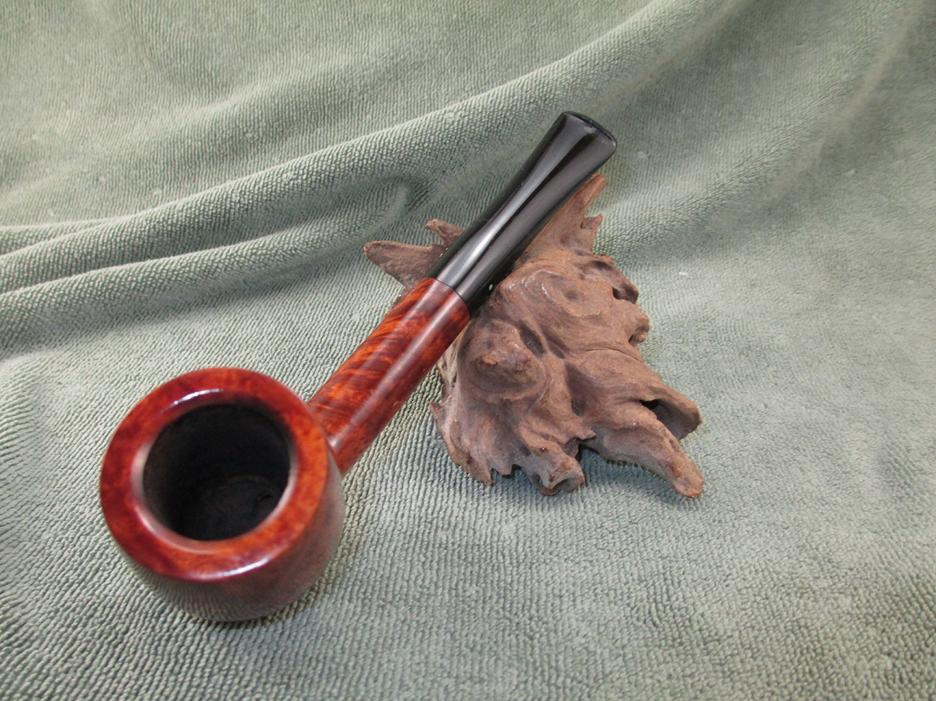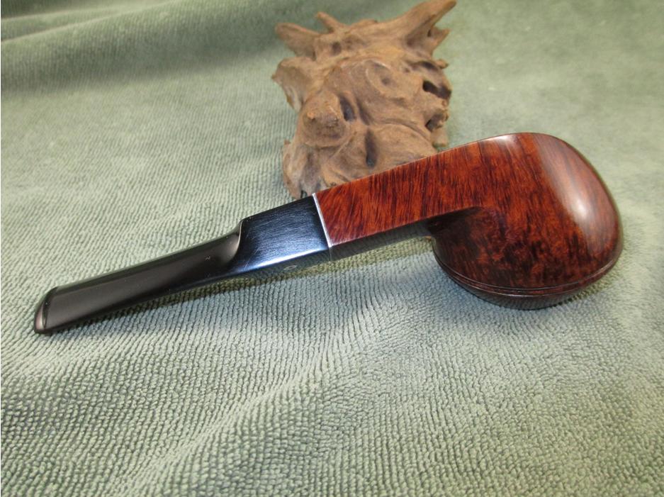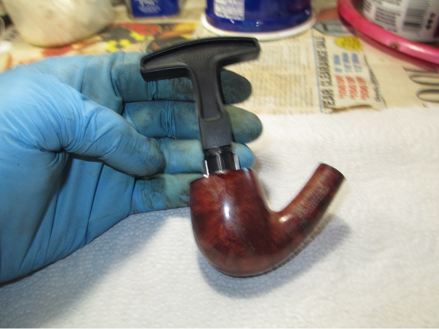 I used the same progression on the stem. I polished the stem using a rotary tool set on the lowest speed with white rouge and carnauba wax. I used my buffing wheel (aka heartbreaker) with white rouge and carnauba wax on the bowl. I reassembled the pipe and wiped on a couple of light coats of Halcyon II wax. Here is the finished result.