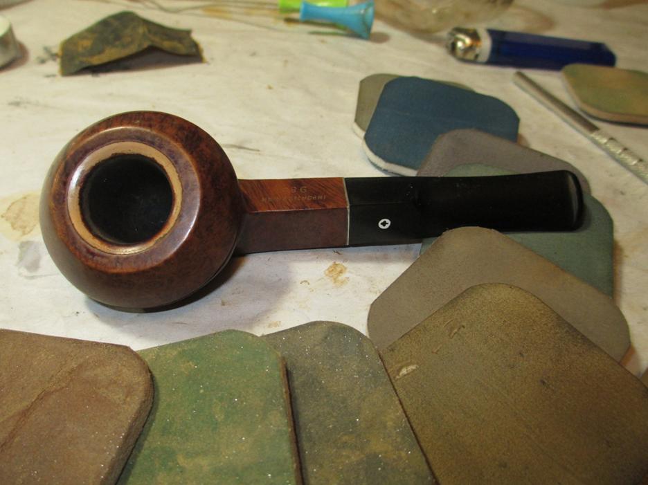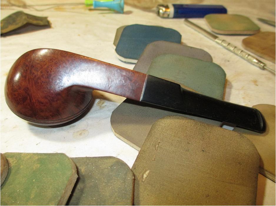 I used 150 grit sand paper on a piece of glass to top the rim and shank, followed by some 400 grit. A note of caution when topping an Oom Paul, the shank and the bowl are close to each other. Be sure not to take off wood where you don’t intend to.