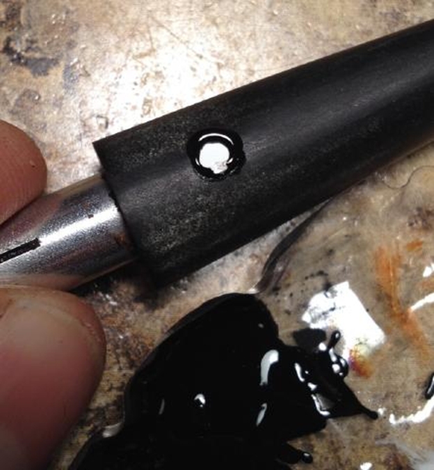 - The patch material is made from the CA and activated charcoal. I used medium viscosity CA. The mix is “close to” 50/50 between the 2…the consistency is more like molasses than honey…very thick.