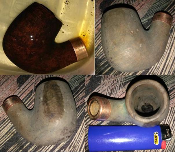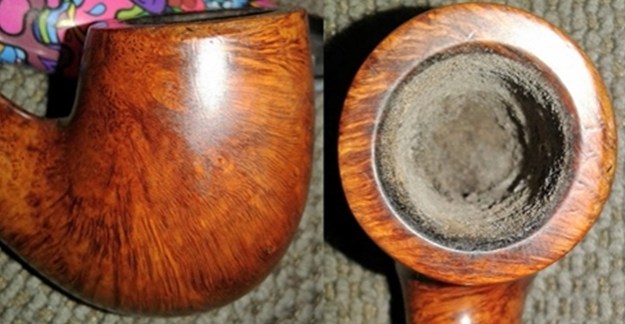 For one thing, I didn’t “offer” my services, it was more like begging Sir Daryl to grant me the honor of taking his beautiful but badly marred and filthy 1911 billiard – yes, that’s the year our Narrator meant to say in his own rather prosaic, ho-hum way –home with me. I asked whether he wanted the final stain to adhere to the original dark brown or be lighter and was not surprised when he opted for the former. Anyone with eyes will see the KB&B was messed up outside from the shots of it I snapped as soon as I was home, which I’ll dig up some place and show in a minute. As far as its innards go, I know more than I really needed to about that because I just had to see what Sir Daryl’s little fit was all about and later tried it in private with some of the cherriest aromatic there is. The consequence indeed was every bit as nasty as my friend Sir Daryl let on!