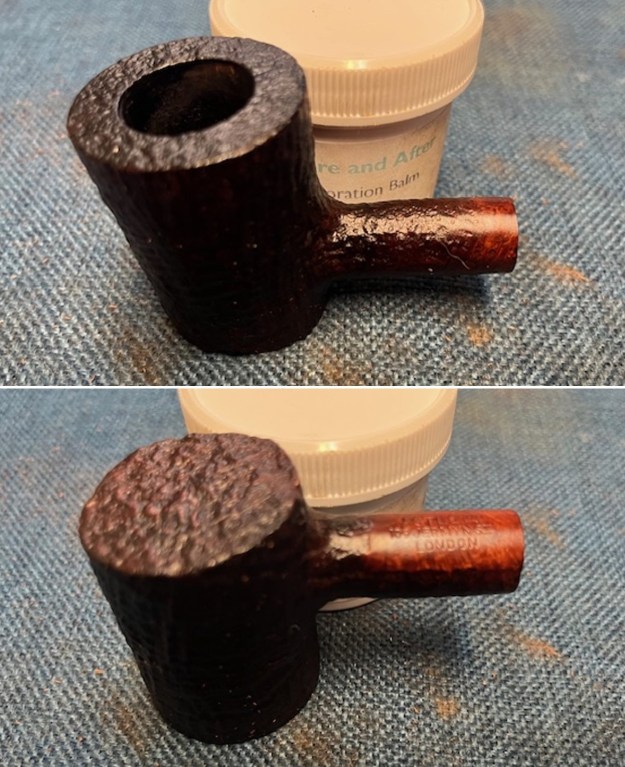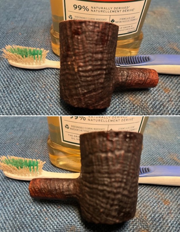 I scrubbed the exterior of the pipe with undiluted Murphy’s Oil Soap and a tooth brush. I rinsed it off with warm running water and dried it off with a soft towel. The bowl looked good. The rim top had some fading that I would need to restain.