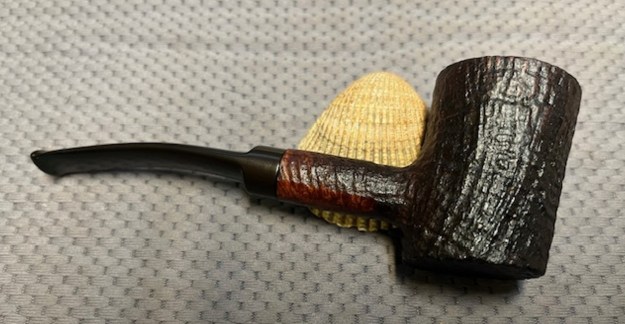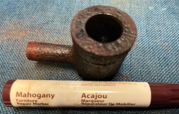 I restained the faded rim top with a Mahogany stain pen to match the rest of the bowl and shank. The match to the rest of the bowl is quite perfect and it really makes the grain pop in the sandblast.