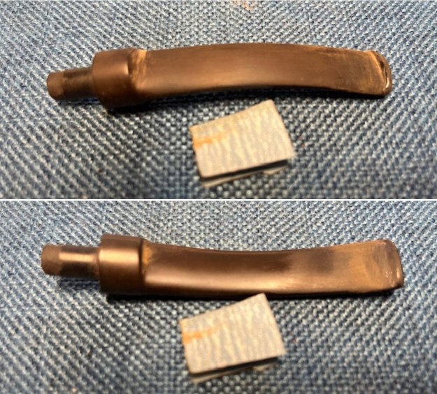 By this time the repairs on the stem had cured so I flattened them out with a folded piece of 220 grit sandpaper. I worked over the button edge. It was beginning to shape up well.