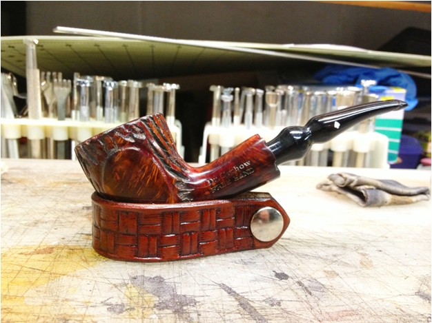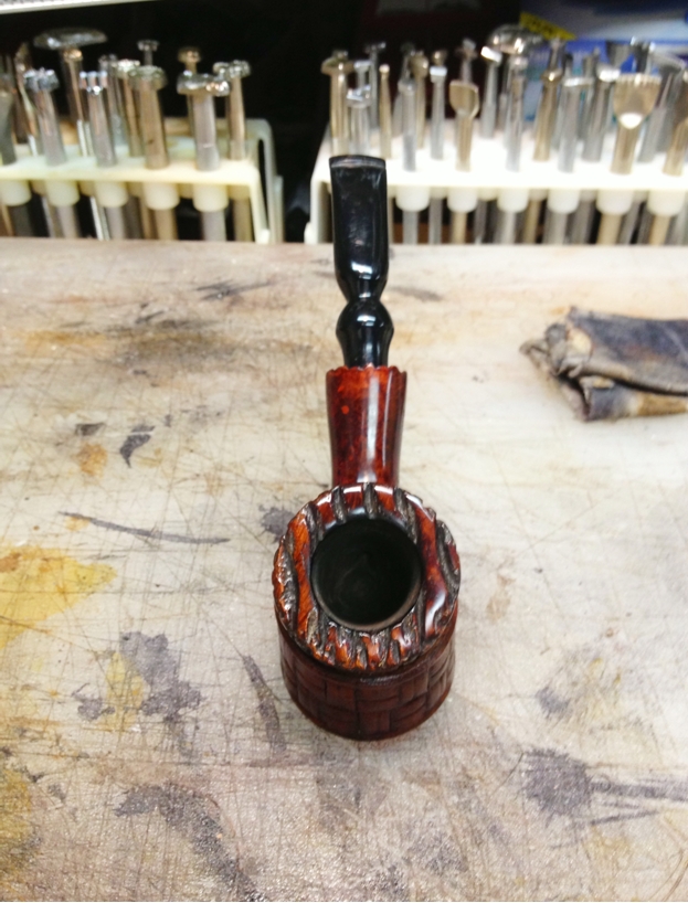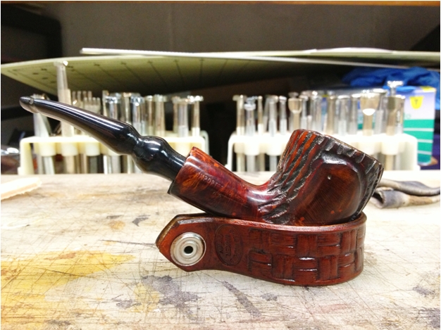 Over the years of collecting and working on CPF pipes I have seen quite a few classic shaped meerschaums but had not seen very many carved figurals. My brother Jeff came across this interesting figural featuring a horse and knowing my love for CPF pipes picked this one up for me. It is a true beauty. There are some small cracks around the bowl but nothing that is an open fissure. I was glad to add it to the collection. Even so you can feel the energy of the racing horse as it turns around the tree stump on its right side. Give the blog a read if you want to see more photos and read about the restoration. https://rebornpipes.com/2016/12/05/against-a-stump-a-carved-cpf-best-make-horse-meerschaum/.