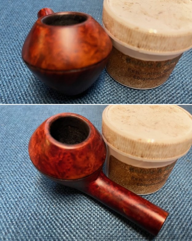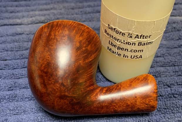 I worked some Before & After Restoration Balm into the smooth briar with my fingertips and the plateau and sandblasted side with a horsehair shoe brush. It enlivens, enriches and protects the briar while giving it a deep glow. I appreciate Mark Hoover’s work in developing this product. I buffed the pipe with a micro fiber cloth to raise the shine and took photos of it at this point it the process. It is a beautiful looking pipe.