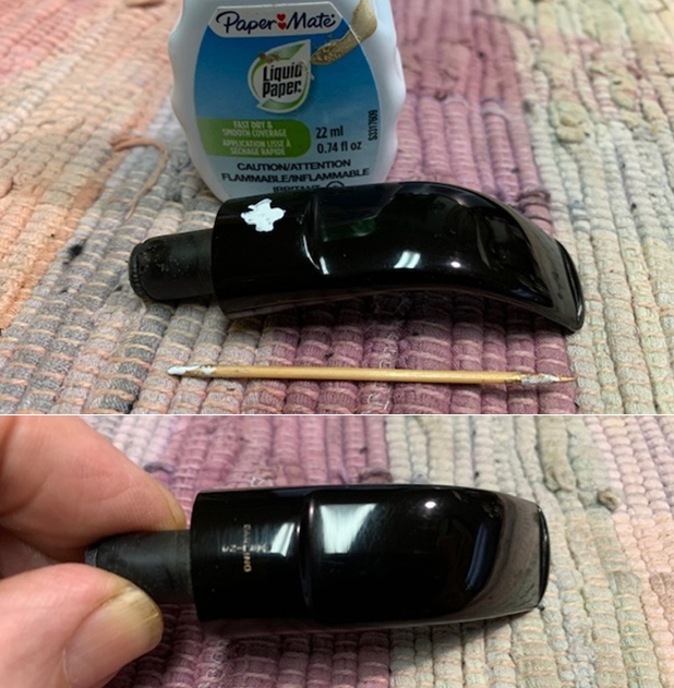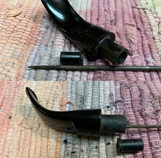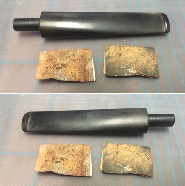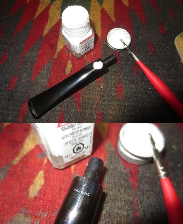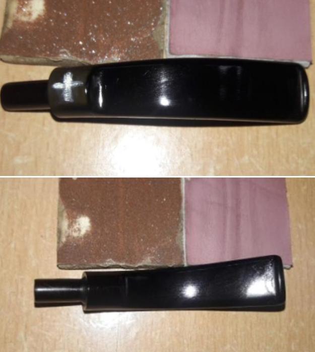I did not soak the stem of this pipe in the Hydrogen Peroxide solution as I was not sure how it would affect the stamping and so decided to play it safe. I flamed the stem surface of the stem with a Bic lighter to raise the tooth indentations and scratches on the stem. The heat from the flame of Bic lighter causes the vulcanite to expand and regain its natural shape, reducing the marks. The tooth bite marks which were visible after the flaming were filled with a mix of activated charcoal and clear CA superglue and I set it aside to cure overnight.