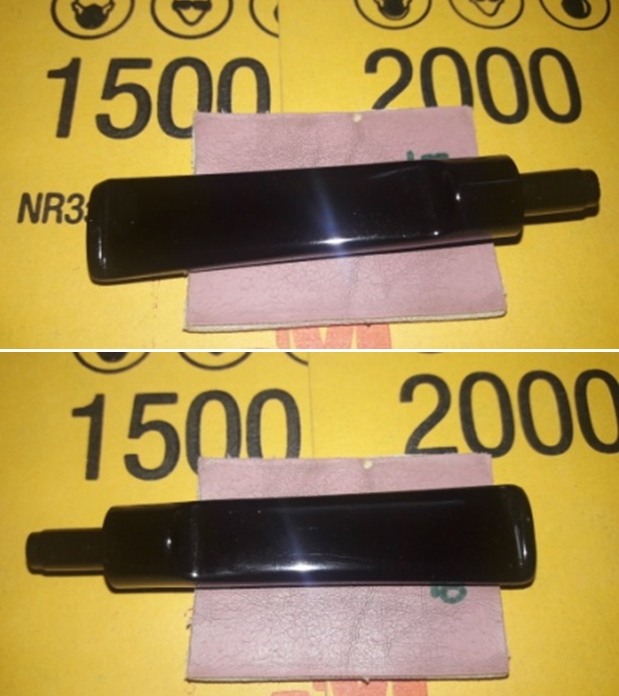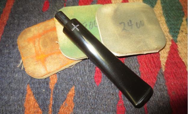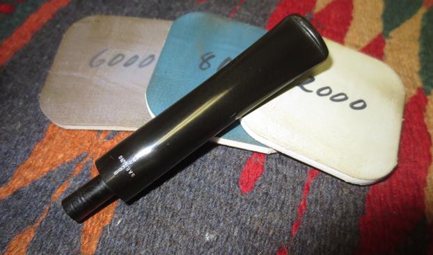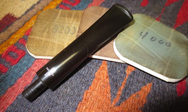 While the stummel was drying, I worked the stem. I covered the stampings on the stem with whitener using a whitener pen. The filling of charcoal and CA superglue had cured and using a needle file, I sand the filling to match the surface of the stem. For a better blending, I further sanded the entire stem with 220 followed by 400 and 800 grit sand paper. This helps to reduce the sanding marks left behind by the more abrasive 220 grit paper. To bring a deep shine to the vulcanite stem, I went through the complete set of micromesh pads, wet sanding with 1500 to 2400 grit pads and dry sanding with 3200 to 12000 grit pads. I wiped the stem with alcohol after each pad and rubbed it down with Extra Virgin Olive oil. The internals of the stem was cleaned out using alcohol and pipe cleaners. The finished stem is shown below.