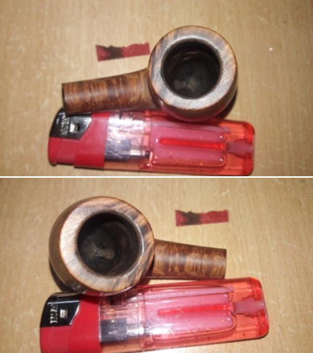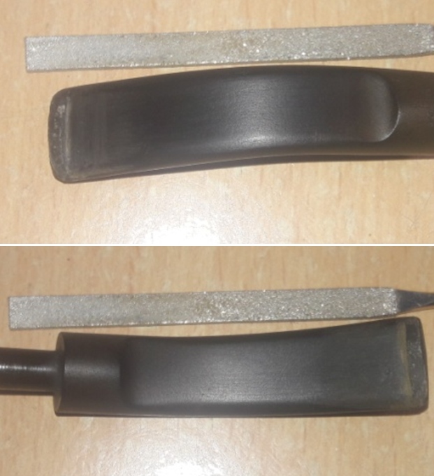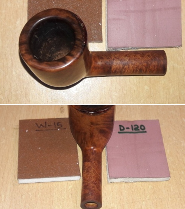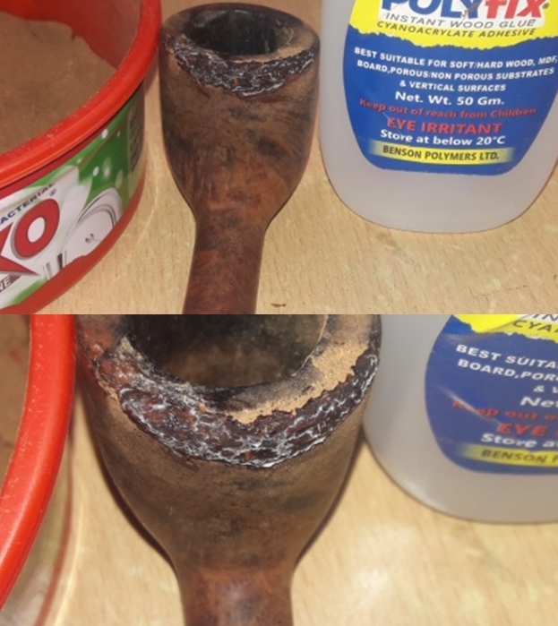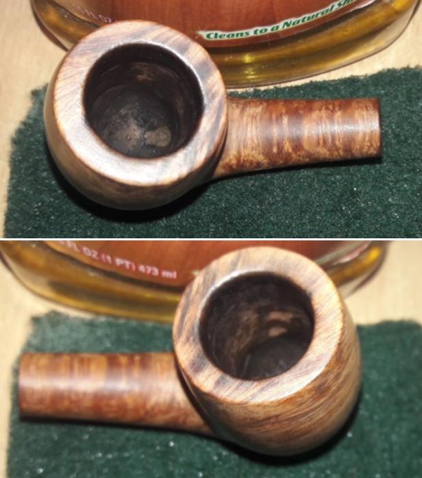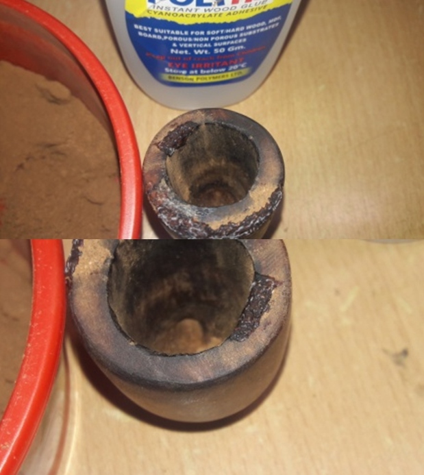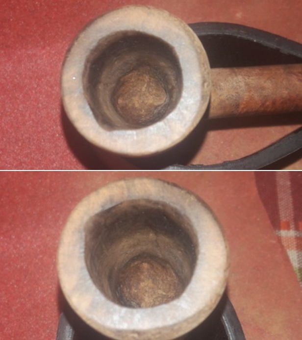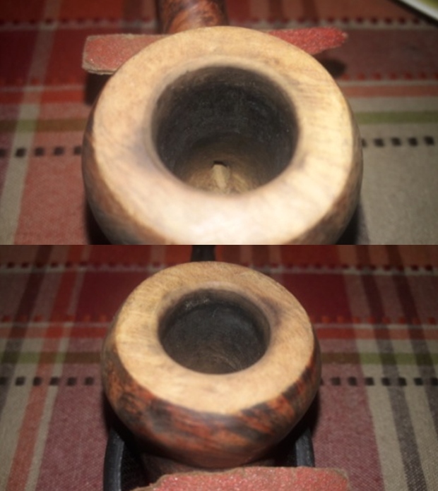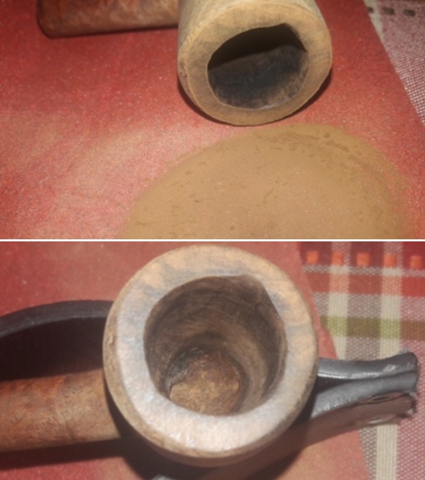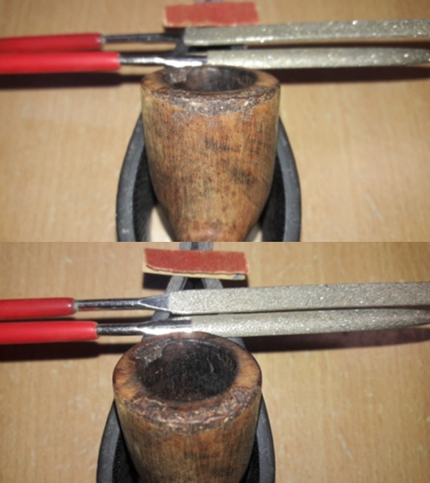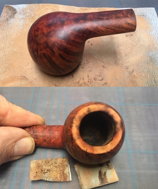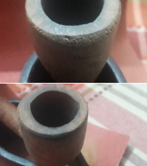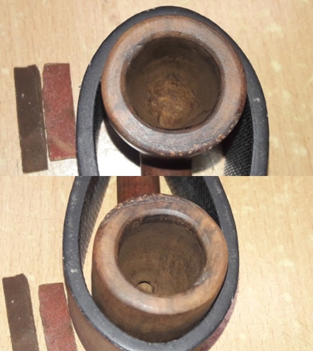 I reamed the chamber with size 1 head of a PipNet reamer and followed it with a size 2 reamer head. To reach the areas where the PipNet reamer could not reach to remove the carbon cake, I used my smaller fabricated knife and scraped out all the remaining cake. I further use a folded piece of 180 grit sandpaper to sand out the last traces of remaining cake and expose the walls of the chamber to ascertain that there are no cracks/ heat fissures. I wiped the chamber with a cotton pad dipped in isopropyl alcohol to remove the carbon dust left behind by all the reaming and sanding process. The walls of the chamber were solid with no damage. I gently scraped the rim top surface with a sharp knife to remove the lava overflow. This was followed by cleaning the mortise with cue tips, pipe cleaners and shank brush dipped in isopropyl alcohol. This further eliminated traces of old smells from previous usage. The old smell was still prevalent, though greatly reduced.