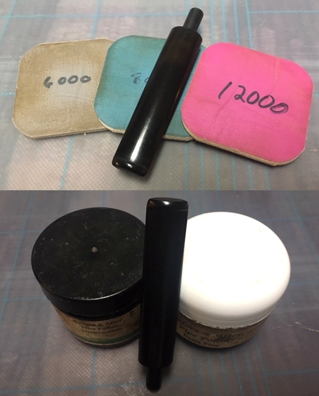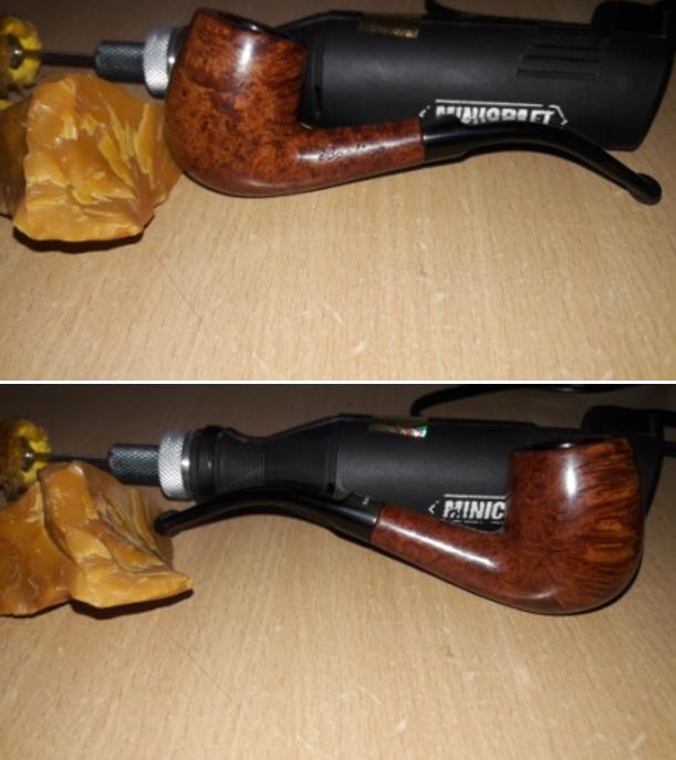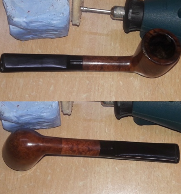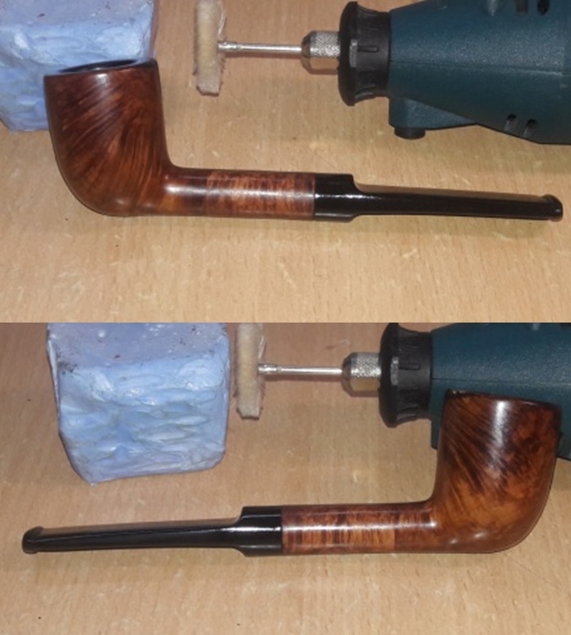 To finish, I re-attach the stem with the stummel. I mounted a cotton cloth buffing wheel to the Dremel (actually it is not the brand machine, but a local machine which is similar). I set the speed at about half of the full power and applied White Diamond compound to the entire pipe. I wiped/ buffed the pipe with a soft cotton cloth to clear it of any leftover compound dust. I then mounted another cotton cloth wheel on to the polishing machine and applied several coats of carnauba wax. I finished the restoration by giving the entire pipe a rigorous hand buffing using a microfiber cloth to raise the shine further.
