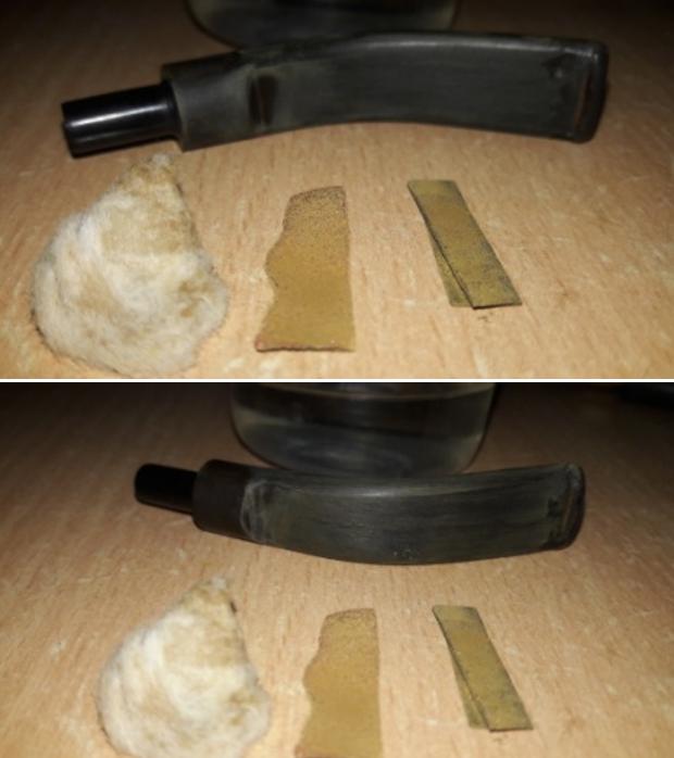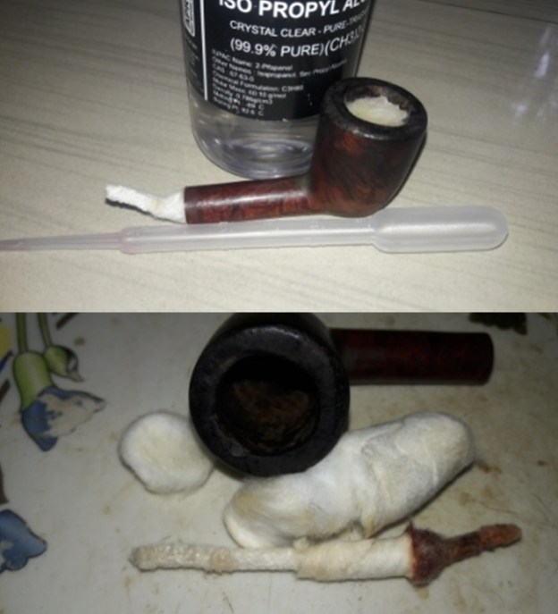 To completely eliminate the smell, I decided to resort to alcohol bath. I packed the chamber, just below the rim, with cotton balls. I stretched a cotton ball into a thick wick, tapering at one end, and inserted it in to the shank and pushed it as far inside as I could using a straightened paper clip. I topped the bowl with isopropyl alcohol using a syringe. I know that it is generally a practice to use Kosher salt for this procedure, but since Kosher salt is not easily available here, and when available, it’s very expensive, I use cotton balls. I find that cotton balls work just fine in drawing out all the tars and smells from the mortise and the bowl. I topped the bowl with alcohol again after 20 minutes when the alcohol level had gone down and set it aside overnight for the cotton and alcohol to do its intended job.