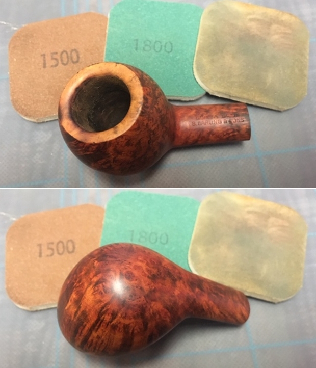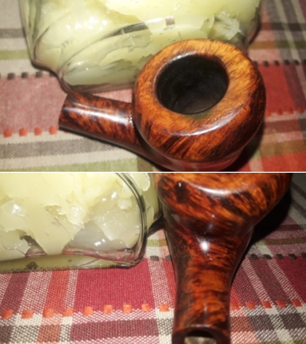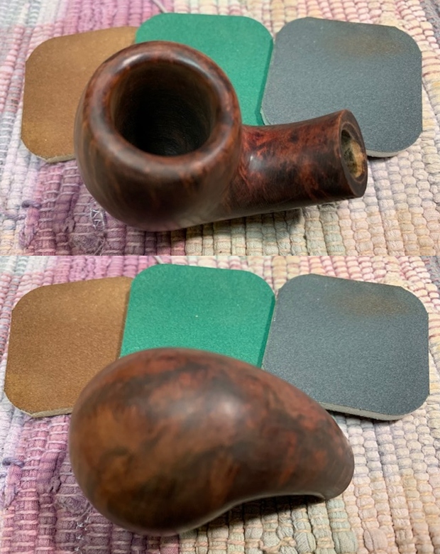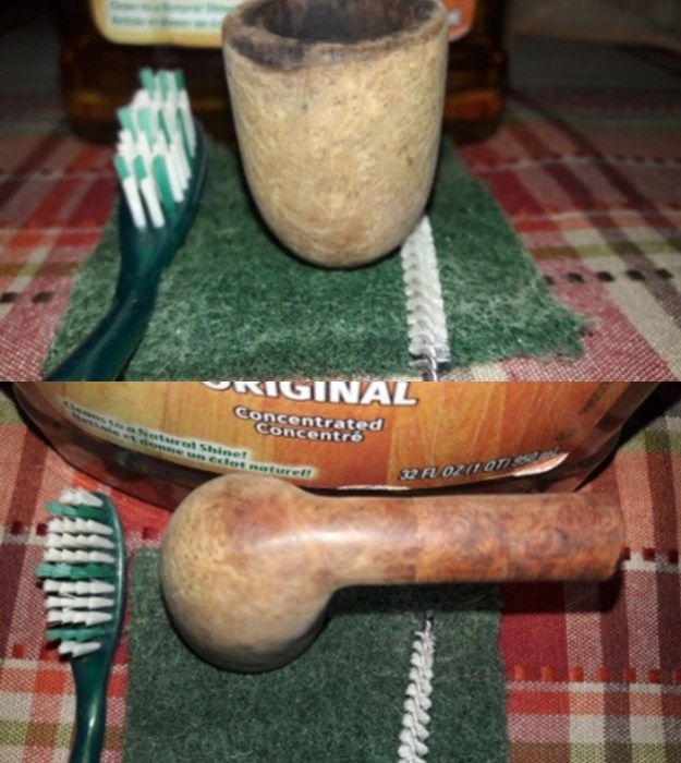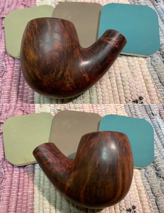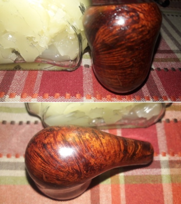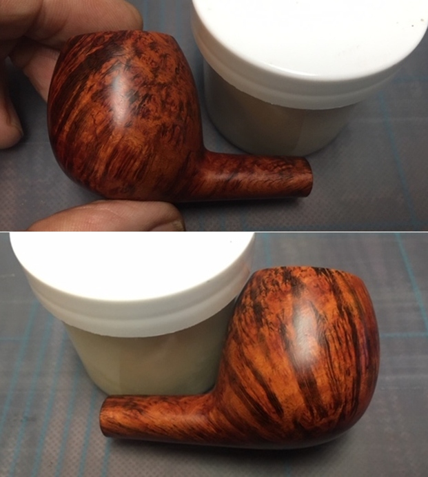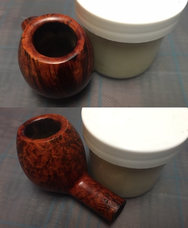 I rub a small quantity of “Before and After Restoration Balm” in to briar and let it rest for a few minutes. The balm almost immediately works its magic and the briar now has a nice vibrant appearance. I further buff it with a horse hair shoe brush.