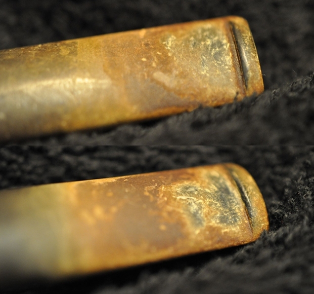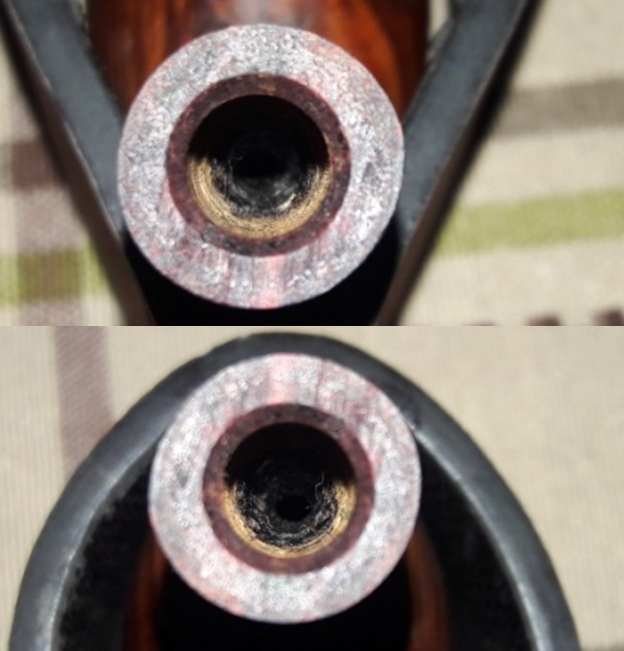 The vulcanite stem is heavily scratched, but not oxidized. Some light tooth chatter is seen on both surfaces of the stem towards the lip with one deep bite mark on the upper surface. This issue should not be a major headache to address. The lip edge on both sides is crisp but lightly damage. The quality of vulcanite is good.