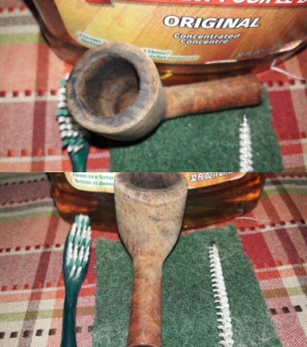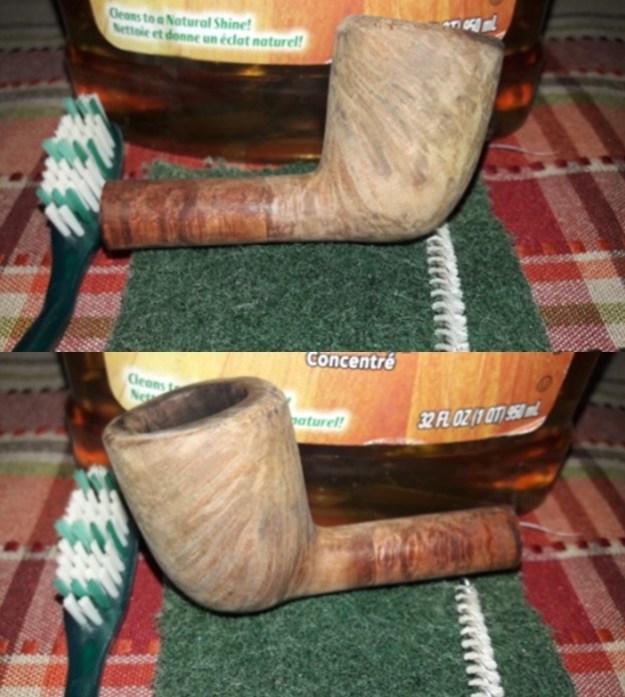 The next day, the cotton and alcohol had fulfilled its intended task. I removed the cotton balls and ran pipe cleaners through the mortise to clean out all the loosened tars and gunk. The internals of the stummel is now clean and fresh. Now, it was the turn of the stummel to get cleaned up. Using a hard bristled tooth brush dipped in undiluted Murphy’s oil soap, I very deliberately scrubbed the surface of the stummel. I cleaned the rim too. The stummel and rim top was dried using paper napkins and soft cotton cloth. I am not very happy the way the rim top appears at this stage with all the charring and uneven inner and outer rim edges. This needs to be addressed. I set the stummel aside to dry out naturally.