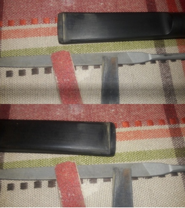After cleaning the rim top with Murphy’s oil soap, I had observed that the rim top surface was charred and the inner edge was uneven, presenting a very sorry appearance. I topped the rim on a 220 grit sand paper, checking frequently till I was satisfied that the charred surface was greatly reduced. The inner edge is still uneven, though much better than before topping, it will need to be addressed.