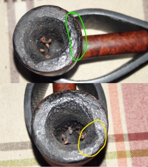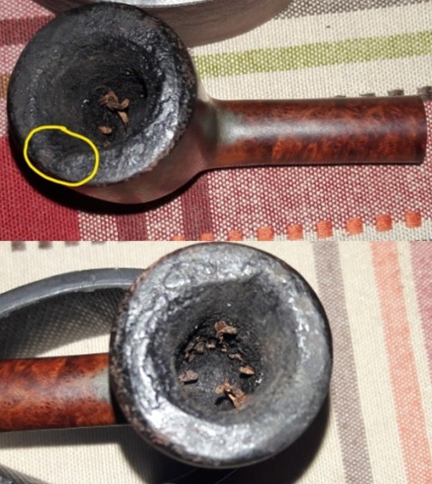 The chamber shows a nice even build up of a thick cake which makes it difficult to comment on the condition of the inner walls of the chamber. There is a thick overflow of lava and completely covers the rim top and further spills over on to the stummel surface. The condition of the inner edge of the rim and rim surface will be ascertained only after chamber has been reamed down to its bare briar. The outer rim, however, is damaged and has a number of chips and dents, probably caused due to hitting the bowl against a hard surface to remove the dottle! Criminal, to say the least!
