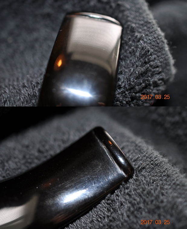 The steaming method had raised to the surface all the major dents and dings. However, the outer and inner edges of the rim were still uneven. I took a piece of used and worn 180 grit sand paper, folded it and pinching it between my thumb and forefinger, created a slight inner bevel on the inner edge of the rim. Using the same technique, I created a light bevel on the outer edge. Now the rim surface and both its edges appear clean, even and well rounded.
