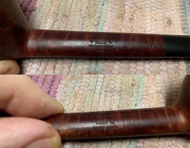 Examples with silver hallmarks illustrate that a distinct change in nomenclature occurred around 1938-40, although clearly the war and London bombings impacted production of silver-mounted and of all English pipes. A George Yale catalog from 1941 features the familiar stampings such as “YE OLDE WOOD”, “TVF”, and style names like “Fossil”, and these were not generally found on pre-1940 pipes, although “YE OLDE WOOD” did inconsistently appear on some earlier examples. (Gage)…