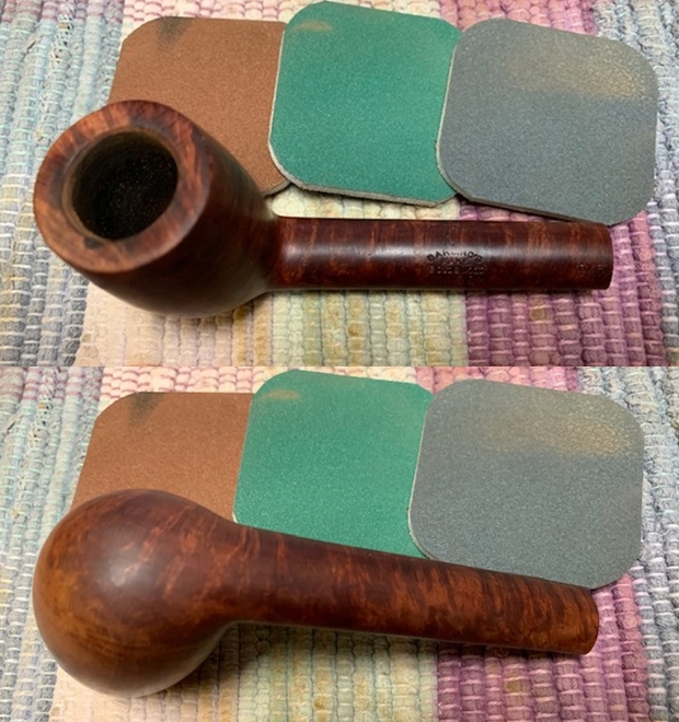 I set the bowl aside and turned my attention to the stem. I “painted” it with the flame of a Bic lighter to lift the tooth dents in the surface of the vulcanite. I was able to lift the majority of them and interestingly the small pin hole on the topside sealed off. I filled in the remaining marks with clear CA glue. Once the repairs cured I used two files to flatten out the repairs and recut the sharp edge of the button. I sanded them smooth with a folded piece of 220 grit sandpaper to blend them in the rest of the stem surface. I started polishing the stem with 400 grit wet dry sandpaper.