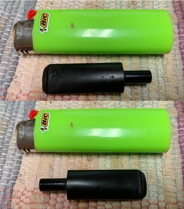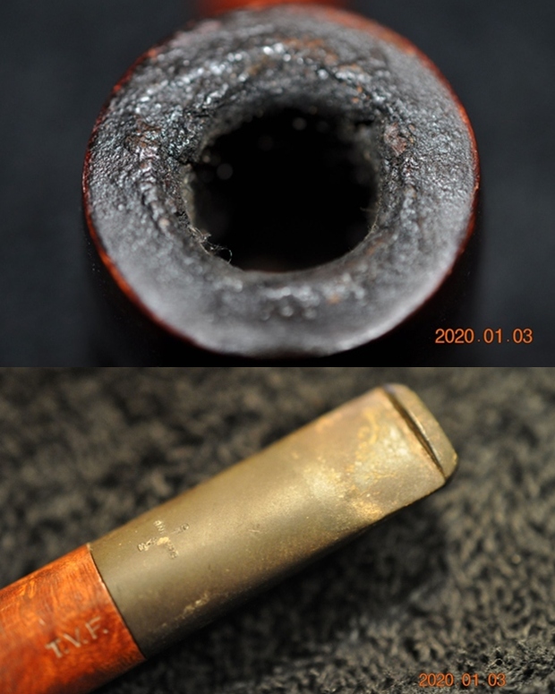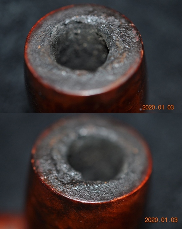 Jeff took photos of the bowl and rim top to show the thickness of the cake in the bowl and the thick lava on the rim top. The rim looks to be heavily damaged under the lava on the top and the inner and outer edges. It really is a mess. He took photos of the top and underside of the vulcanite stem showing the tooth marks, chatter and wear on the stem and button.