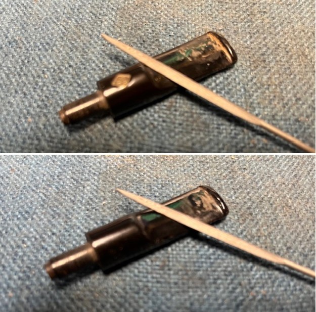 In order to address the oxidation, I dropped the stem in an oxidation removing fluid and left it to sit overnight. This mixture tends to draw the stem’s oxidation to the surface, where it can be more easily removed. When the stem was done soaking, I scrubbed the stem with some surface cleanser squirted on cotton rounds. This worked very well at removing the unsightly oxidation.