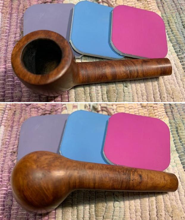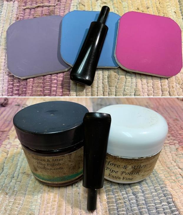 This internal cleaning was followed by sanding the stem external surface with a folded piece of 220 grit sandpaper to loosen up and remove superficial oxidation. It has been our experience that such sanding yields the best end results after the deoxidizer solution has completed its assigned task. Before dunking the stem in the deoxidizer solution, it was cleaned up with Murphy’s Oil Soap and a cotton swab.