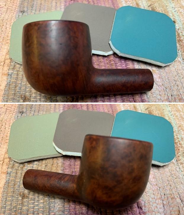 I used a Maple Stain Pen to stain the inside of all of the shrunken pits and divots in the side of the bowl and shank. I filled in the stained areas with clear CA glue to even them out with the surrounding briar. I sanded them smooth with a folded piece 220 grit sandpaper to blend them into the briar. The stained pits worked better than my previous uses of just briar dust and glue. That normally turns black where this seems to allow the brown to come through the clear glue. I polished the areas with 400 grit wet dry sandpaper.