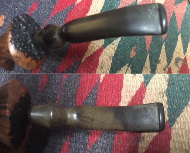 Jeff had done a great job cleaning up the pipe as usual. He reamed the pipe with a PipNet reamer and cut back the cake back to the bare briar. He cleaned up the walls with a Savinelli Fitsall Pipe Knife. He scrubbed the interior of the bowl and shank with pipe cleaners, shank brushes, cotton swabs and alcohol to remove the tars and oils. He scrubbed the exterior of the pipe with undiluted Murphy’s Oil Soap and a tooth brush to remove the grime from the finish. He worked on the rim top lava and darkening with the soap and tooth brush. He scrubbed the inside of the stem with alcohol and shank brushes, pipe cleaners. He scrubbed the exterior with Soft Scrub and then soaked it in Briarville’s Pipe Stem Deoxidizer. He washed it off with warm water to remove the Deoxidizer. The pipe looked far better when it arrived.