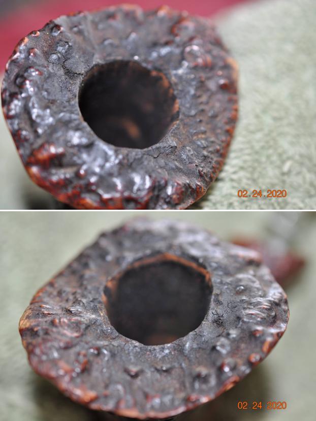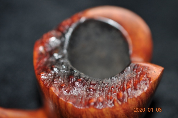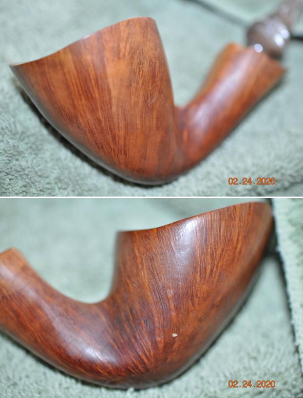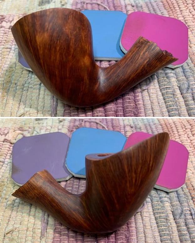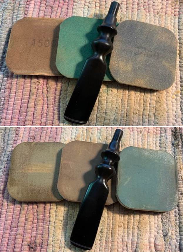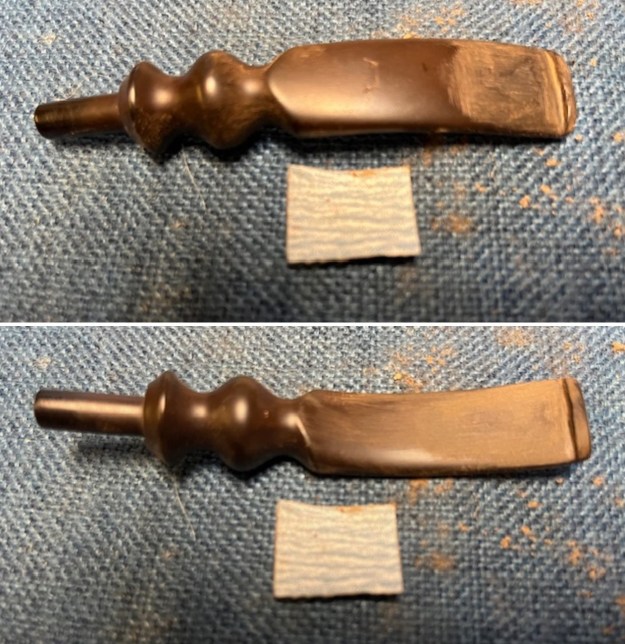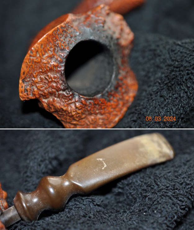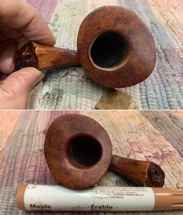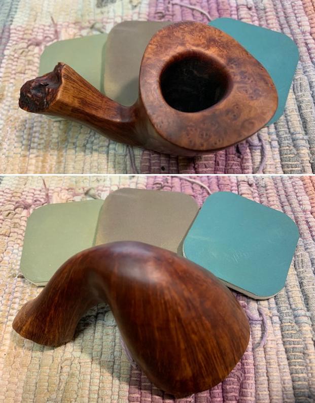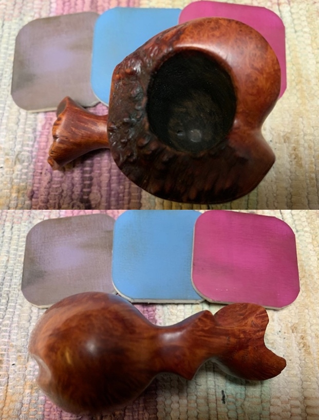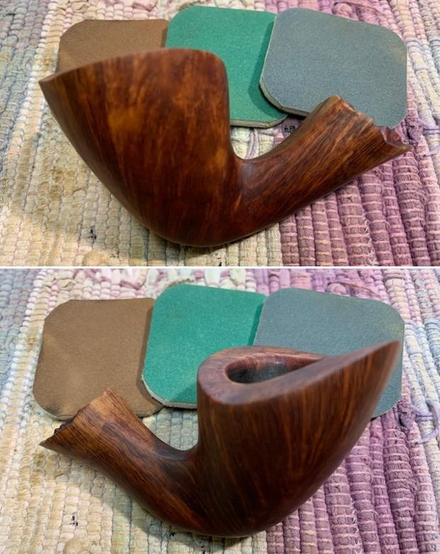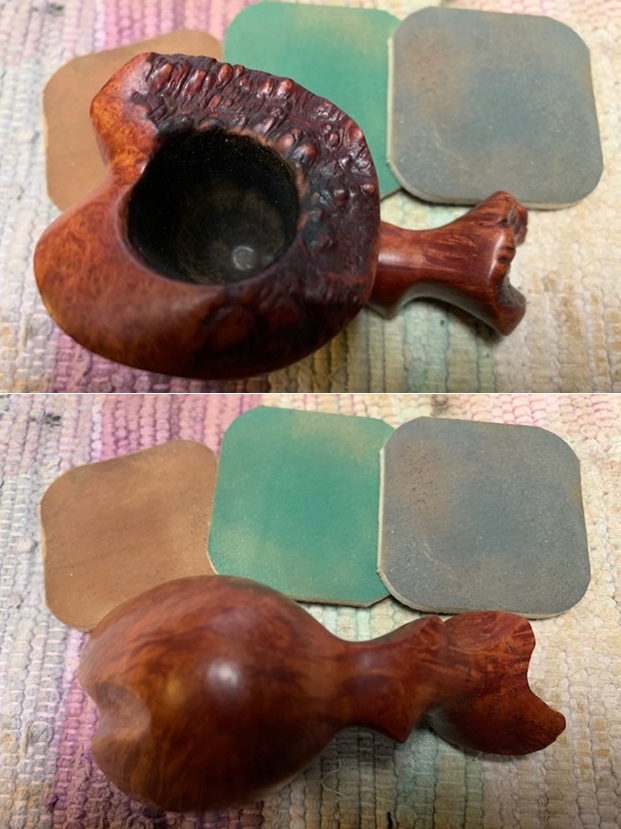 The damage to the rim was significant. In order to lessen the scrapes on the rim, I ‘topped’ the pipe – that is to say, I gently and evenly sanded the rim on a piece of 220-grit sandpaper. This effectively minimized the damage, without altering the look of the pipe. Some damage will always remain and that is fine – it’s part of this pipe’s history.