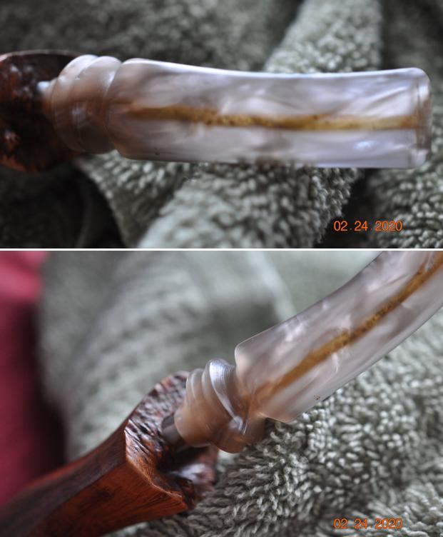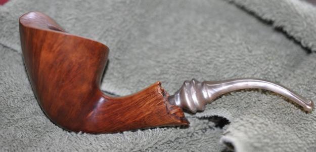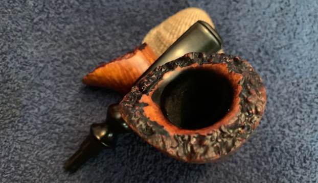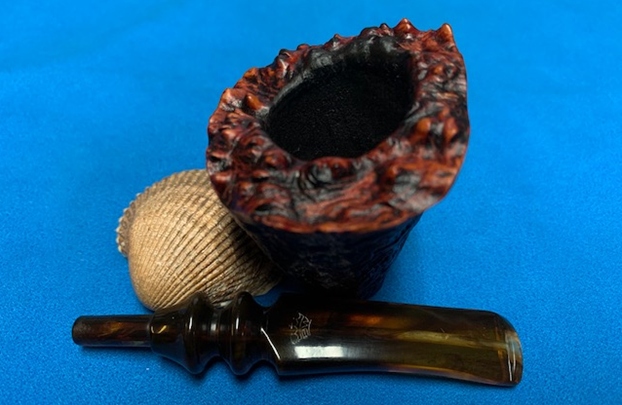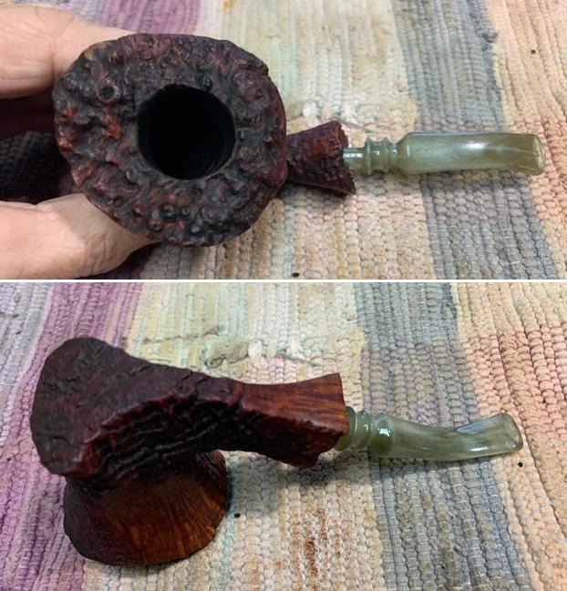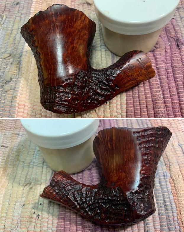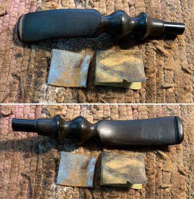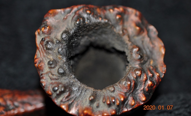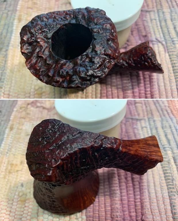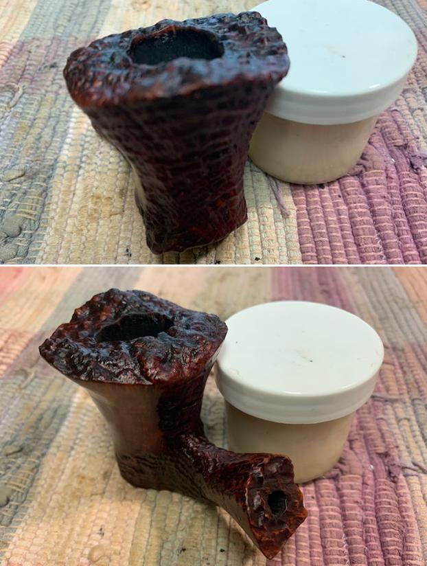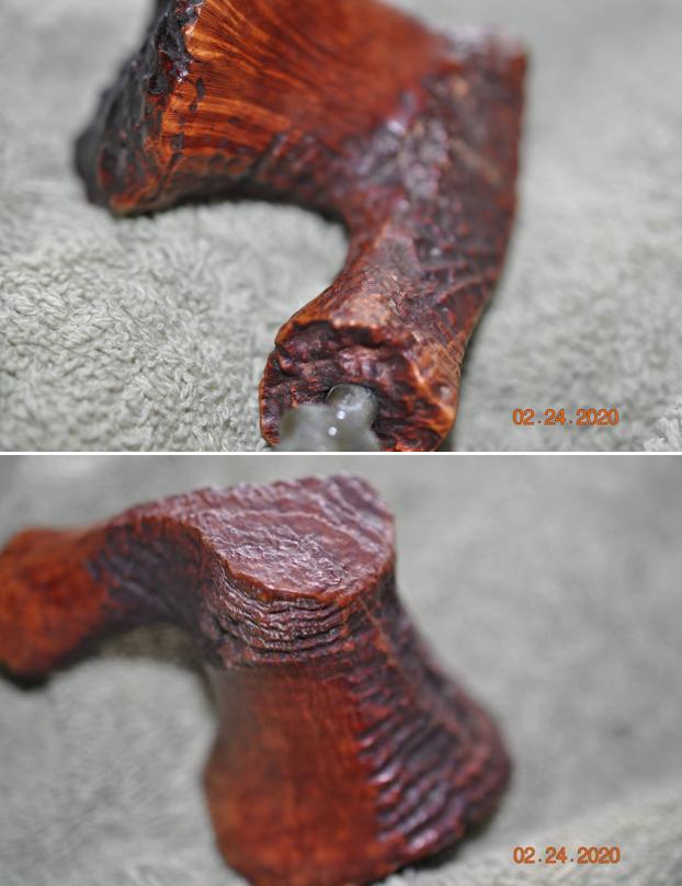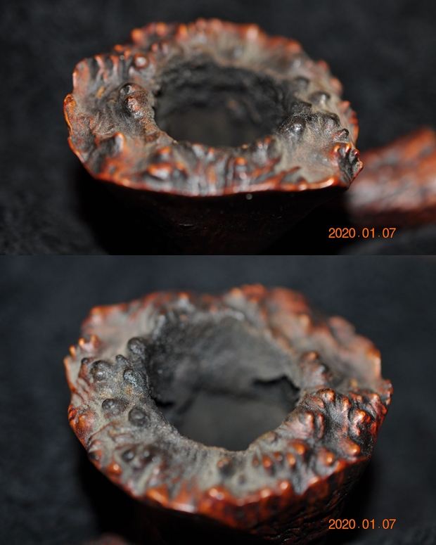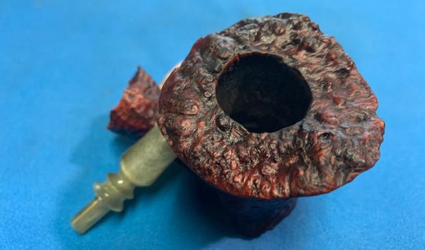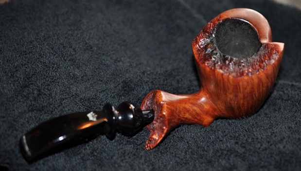 The damage to the rim was significant. In order to lessen the scrapes on the rim, I ‘topped’ the pipe – that is to say, I gently and evenly sanded the rim on a piece of 220-grit sandpaper. This effectively minimized the damage, without altering the look of the pipe. Some damage will always remain and that is fine – it’s part of this pipe’s history.