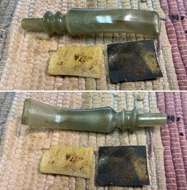 Once the stem was reasonably clean, I soaked it overnight in some Briarville Stem Oxidation Remover. This solution works to draw oxidation in the stem to the surface of the vulcanite. This is a major aid and an important step in ensuring a clean stem. The following day, I drew out the stem from its bath and scrubbed the lingering fluid with a toothbrush. Due to the severity of the oxidation, I then repeated the scrubbing with the cream cleanser for maximum effect.