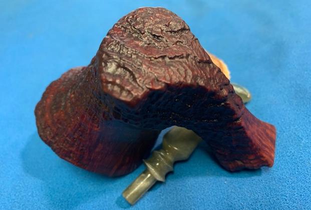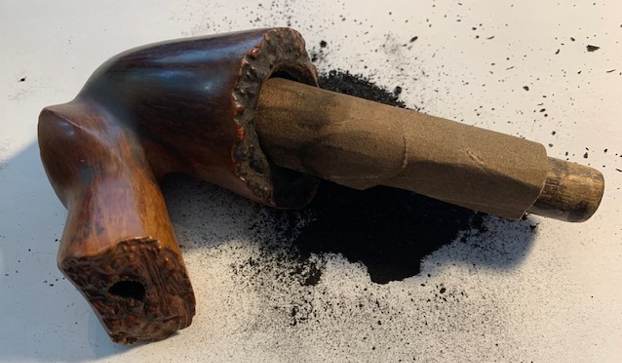 As the stem was (nearly) complete, I moved on to the stummel. The first step was to ream out the bowl – that is to say, remove all the cake inside the bowl. This accomplished a couple of things. First (and most obviously), it cleaned the bowl and provided a refurbished chamber for future smoking. Second, when the old cake was removed, I could inspect the interior walls of the bowl and determine if there was damage or not. I used a reamer, a pipe knife, and a piece of sandpaper taped to a wooden dowel. Collectively, these ensured that all the debris was removed.