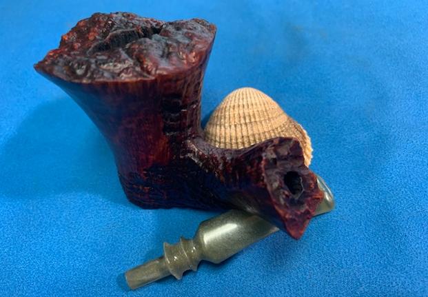 The inside of the stummel needed to be cleaned thoroughly. However, this pipe was so clogged, that I first needed to open the horribly occluded airway. So, I took a long drill bit and hand-cranked it to dislodge the dreadful detritus inside. Hand cranking is essential because it provides a precision and caution that a power drill cannot provide. Similar to the stem, I then cleaned the stummel with both pipe cleaners and cotton swabs dipped in lemon-infused 99% isopropyl alcohol. This stummel was sooooo dirty. It took ages and much cotton to get clean – much more than is shown in the photo.