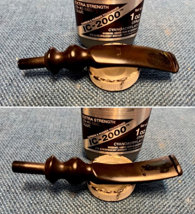 The penultimate step for the stem is sanding. First, with my set of needle files, I reduced the bulk of the cyanoacrylate repairs. I removed the excess adhesive as near to the surface as possible, without cutting into the vulcanite. Following that, I used all nine of the micromesh sanding pads (1,500 through 12,000 grit) to sand out flaws, even out the vulcanite, and provide gentle polishing of the finished surface. I also applied pipe-stem oil while using the last five micromesh pads. There was a wonderful, deep black shine to the stem when I was done.