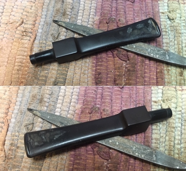 I set the bowl aside and turned my attention to the stem. I used the Dremel and sanding drum to reduce the diameter of the stem as much as I safely could do and then used a flat file to take it further. I cleaned up the diameter fit with a smaller flat needle file. It worked well to remove the excess acrylic to match diameter of the shank. It was getting there.