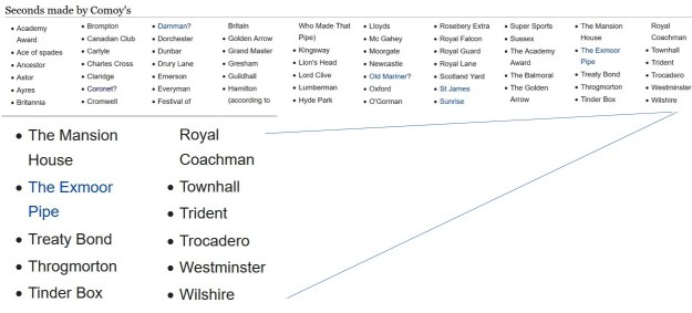 Knowing that the pipe was made by Comoy I turned to the article on Comoy on Pipedia to see what I could learn (https://pipedia.org/wiki/Comoy%27s#Seconds_made_by_Comoy’s). Beside the great history article there was a section with photos toward the end of the article entitled Seconds Made by Comoy’s. There were no photos of the pipe but there was a list of these pipes and the last entry in the list was the Wilshire. The screen capture below shows the list as a whole and I have taken the last two columns and enlarged them below. The last item in the list is this brand of pipe.