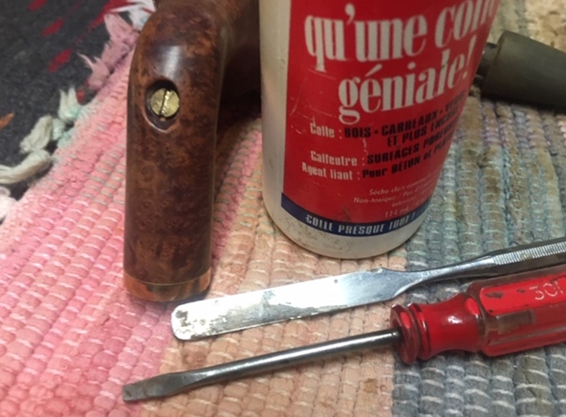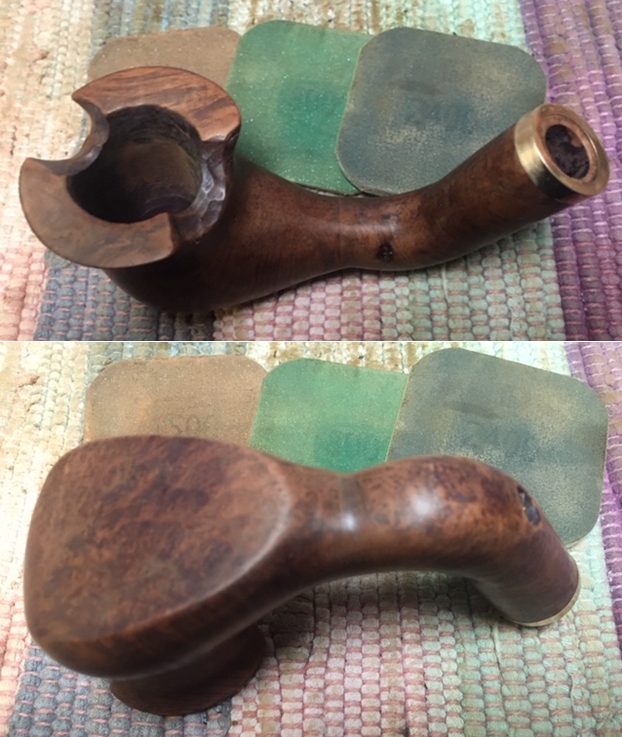 As I mentioned earlier, the rim of the stummel was pretty ugly and also needed to be addressed. A combination of techniques was used to sort this out. In order to remove the lingering bits of lava and fix the nicks, I “topped” the pipe – that is to say, I gently and evenly sanded down the rim on a piece of 220-grit sandpaper. This effectively removed the lava and the damage, without altering the look of the pipe. I then took a solid wooden sphere, wrapped sandpaper around it, and sanded the inner bevel thoroughly. This was to achieve on the inner part of the rim the same thing that I achieved by “topping” the rim on sandpaper.