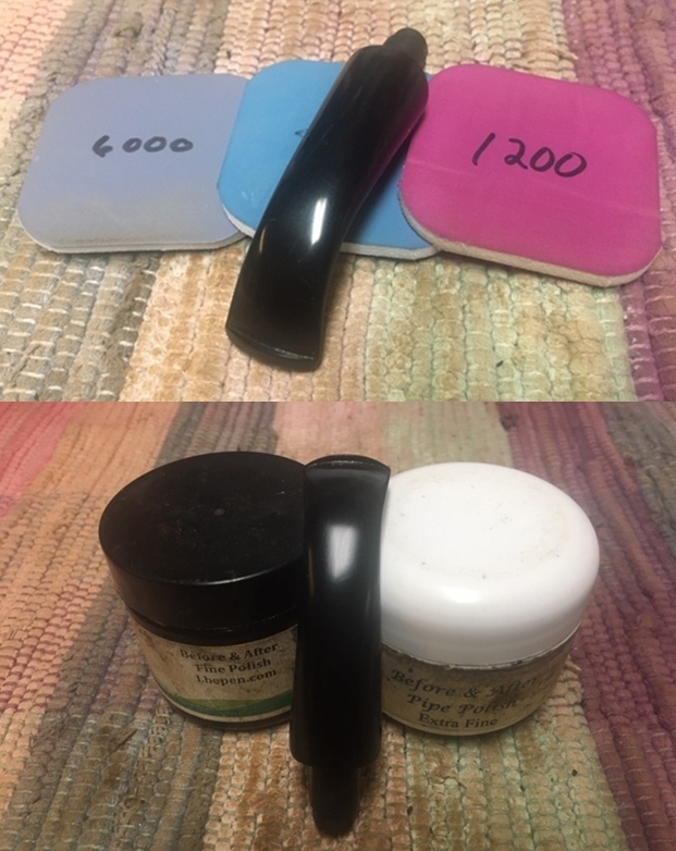In order to finish up the stem, I took a BIC lighter and ‘painted’ it with its flame in order to lift the slight tooth marks. This was reasonably successful in raising the dents. Before I moved on to the Micromesh pads, I built up the small dents on the stem with cyanoacrylate adhesive and let them fully cure. I then sanded it down with 220-, 400-, and 600-grit sandpapers to meld the repair seamlessly into the stem. This ensures that it keeps its shape and looks like it should. I then used all nine Micromesh pads (1,500 through 12,000 grit) to bring out the lovely black lustre on the stem. I also used Obsidian Pipe Stem Oil in between each pad scrubbing.